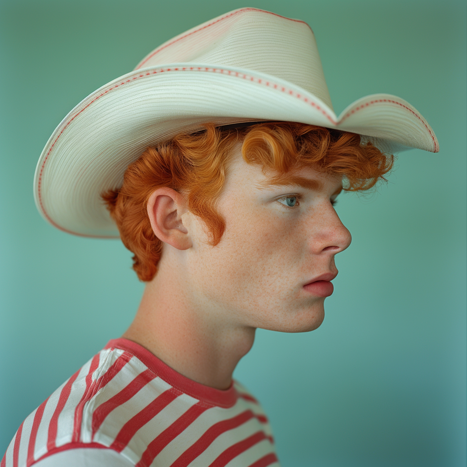 Profile of a young man with red hair, freckles, and a cowboy hat, wearing a red-striped shirt against a teal background.