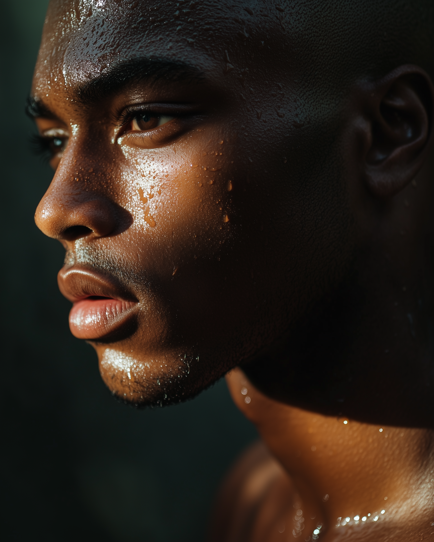 Close-up of a young Black man with glistening skin, warm lighting, and a contemplative expression, emphasizing natural beauty and texture.
