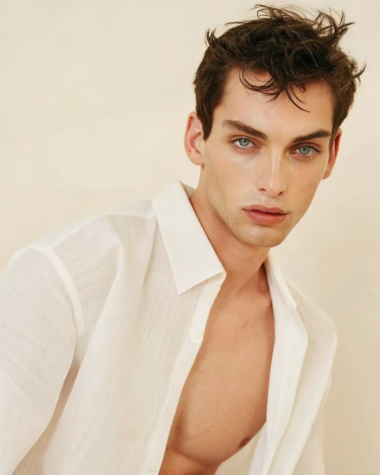 Young man with tousled dark hair, blue-green eyes, and an unbuttoned white shirt against a soft beige background.