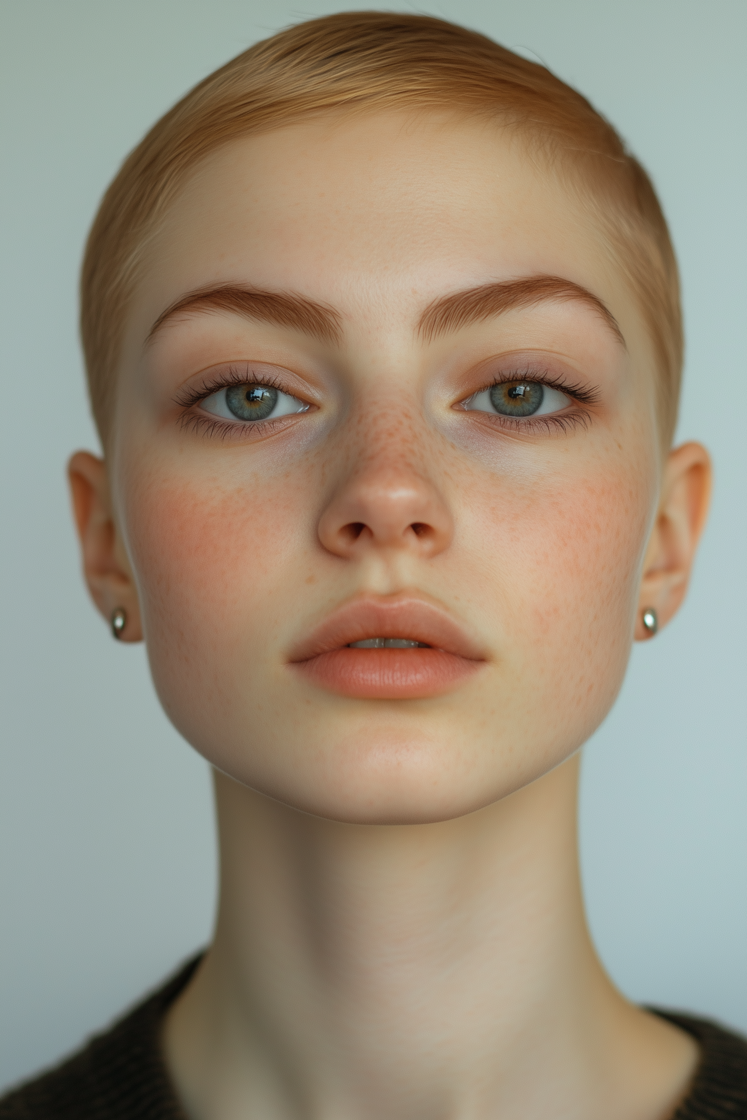 Close-up of a young woman with short blonde hair, green eyes, and freckles, wearing silver stud earrings against a soft, neutral background.