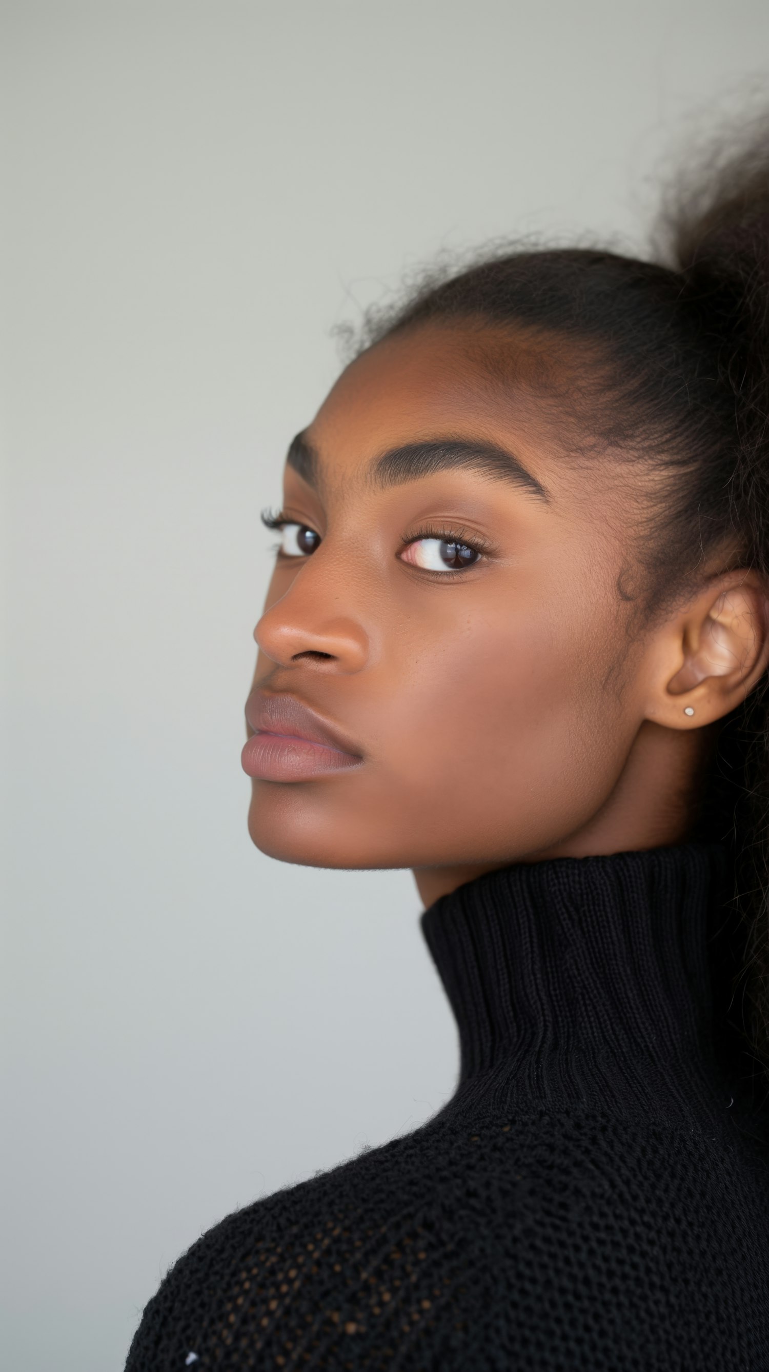 Close-up of a young Black woman in a black turtleneck, with smooth skin, thick eyebrows, and a confident gaze against a neutral background.