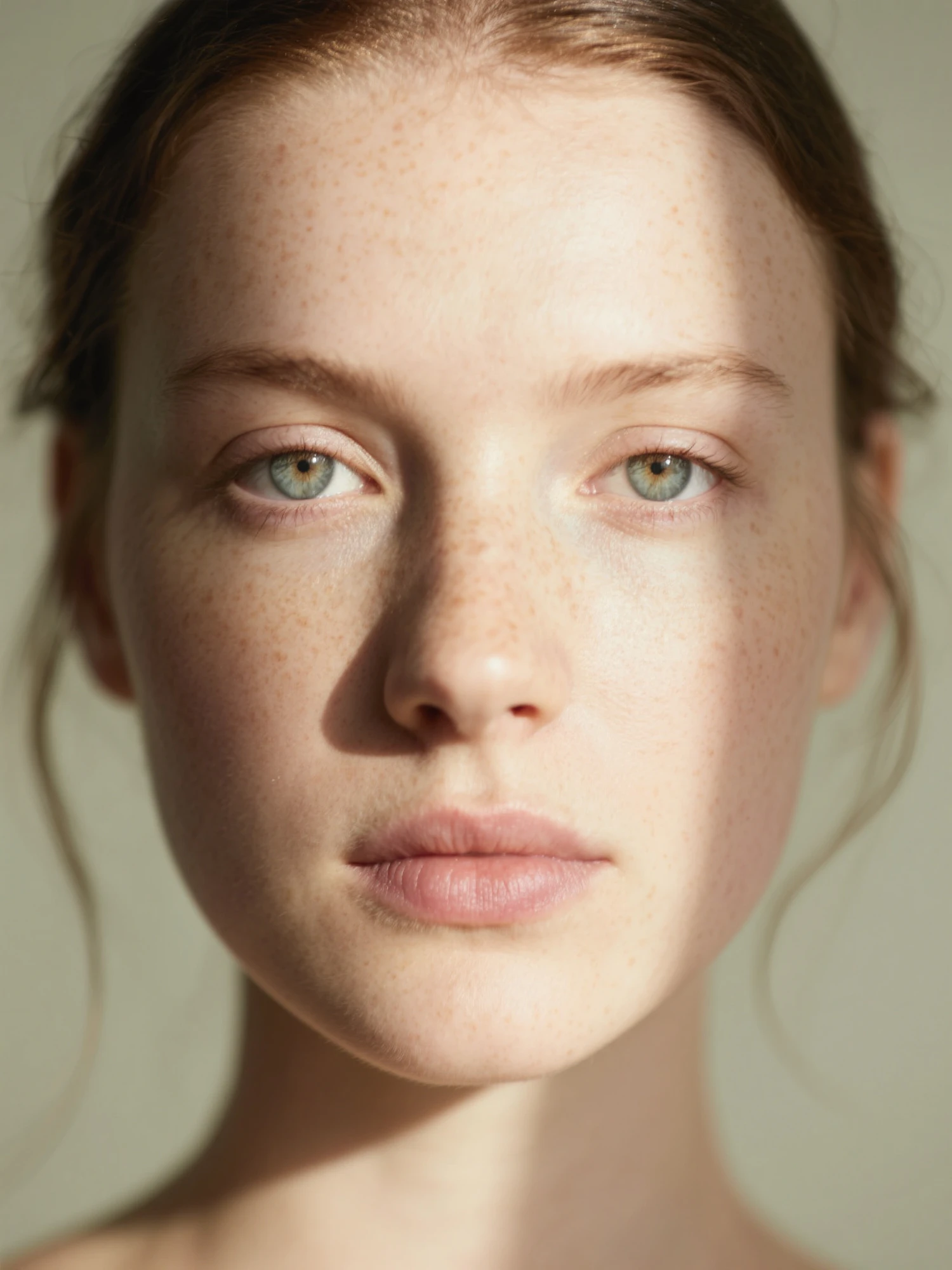 natural daylight portrait, calm and refined mood, clean background, minimal aesthetic, warm soft tones and sage or beige palette, realistic photography, elegant composition, no makeup or very natural look, soft skin texture, cinematic lighting — close-up of a serene woman with freckles and loosely tied hair, soft shadows on her face