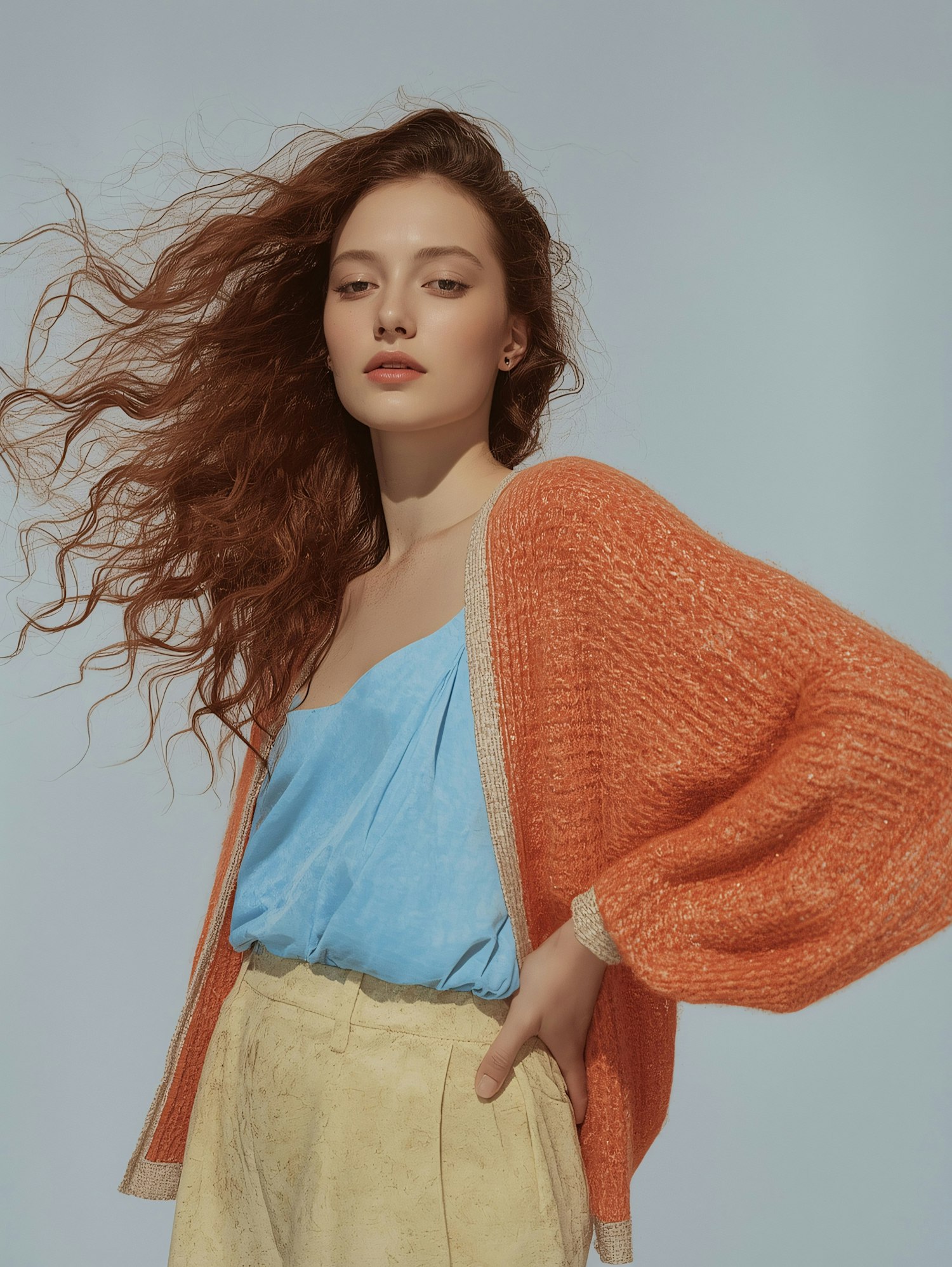 Stylish woman in a vibrant orange cardigan and pastel outfit, posing confidently against a soft blue background.