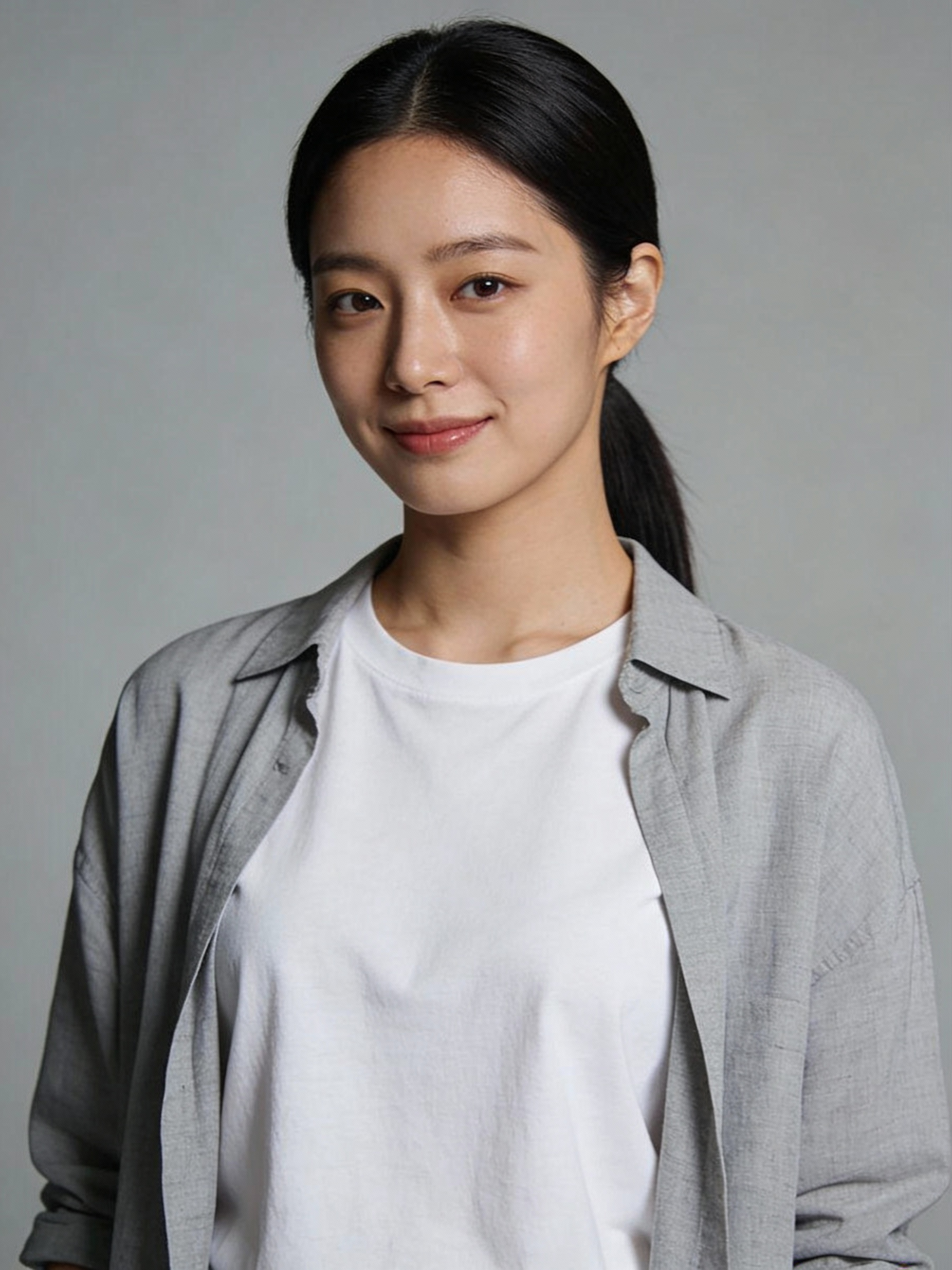 Studio portrait of a Korean female in her late 20s; straight black hair in a sleek low ponytail; light skin, neutral undertone; simple white boxy t-shirt under a light gray open shirt, no logos; neutral mid-gray seamless backdrop; Rembrandt lighting with soft fill; 105 mm macro-sharp. Expression: calm and minimalist, subtle closed-mouth smile. Framing: portrait orientation, 3:4 ratio; mid-chest-up composition. Subject centered in frame, camera at eye level, facing directly toward the camera (front view). Full head and hair completely inside the frame with a little space above; both shoulders visible, no cropping at the top or sides. Neutral studio composition, no props.