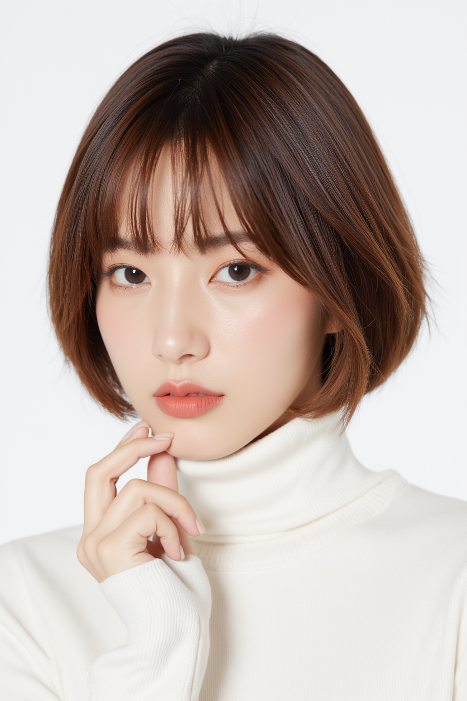 Close-up of a woman with short brown hair, light makeup, and a white turtleneck, posing against a clean white background.