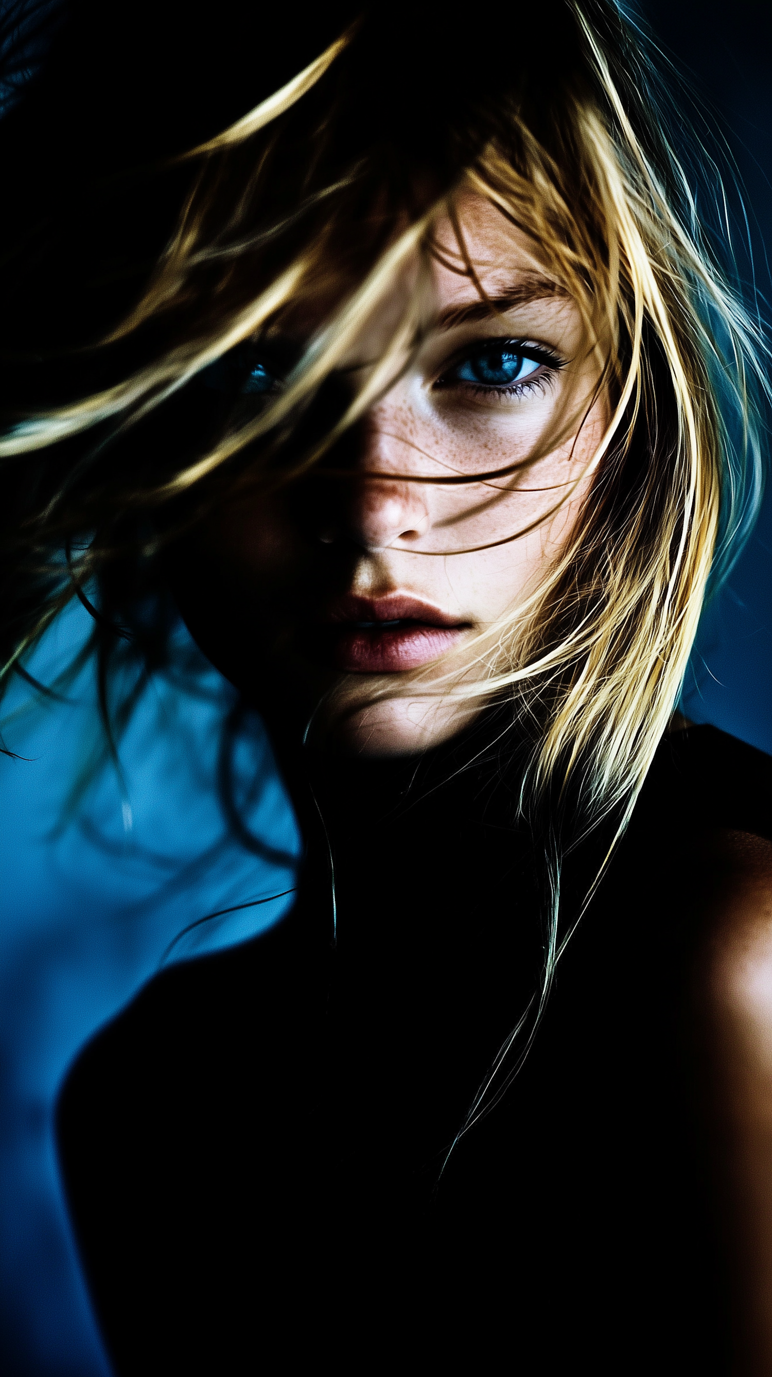 Close-up of a woman with blonde hair and piercing blue eyes, her face partially shadowed with a dramatic blue background.