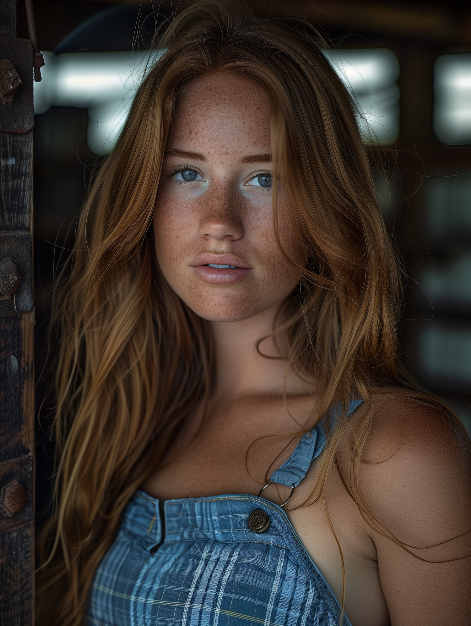 Portrait of a young woman with auburn hair and freckles, wearing a blue plaid dress. Her blue eyes and serene expression stand out.