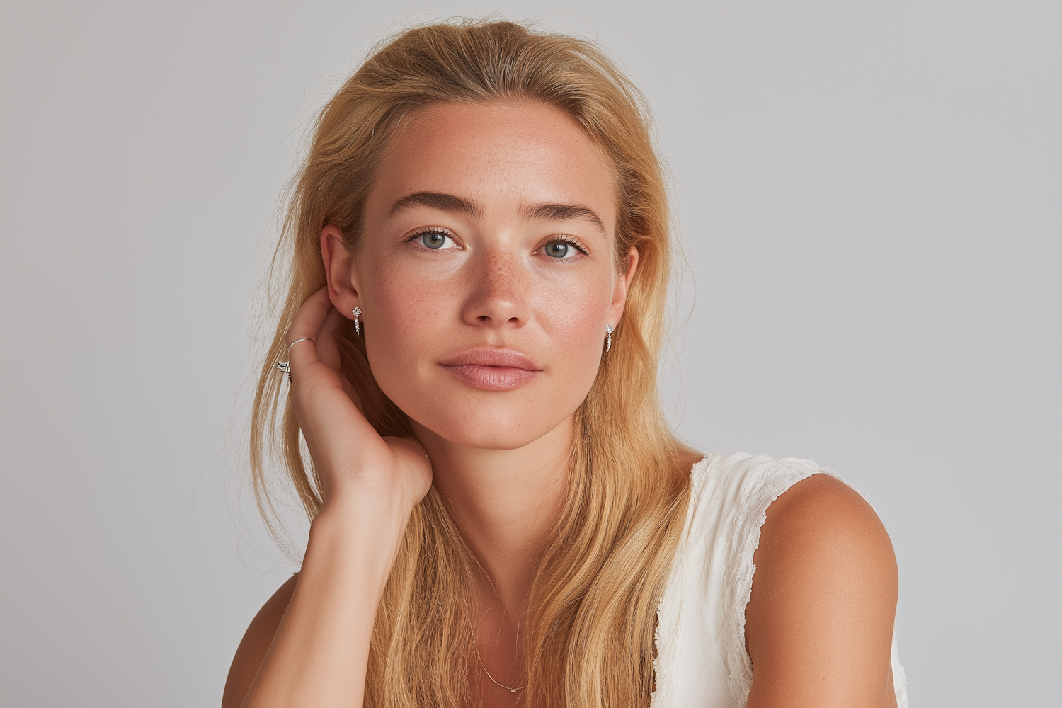 Close-up portrait of a blonde woman with light blue eyes, wearing a white top and elegant earrings, resting her hand on her face.