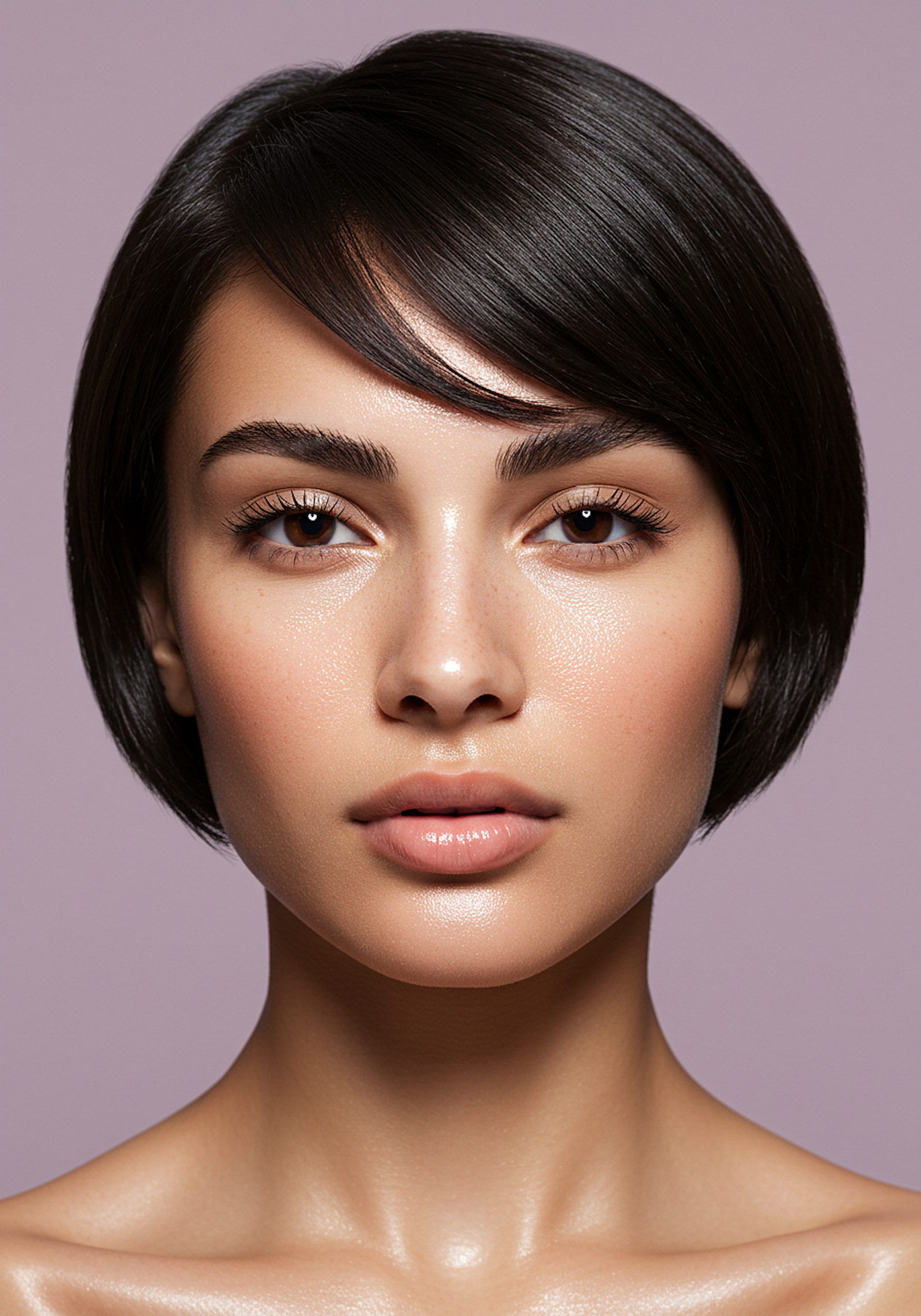 Close-up of a woman with sleek black bob, glowing skin, and natural makeup against a soft lavender background.