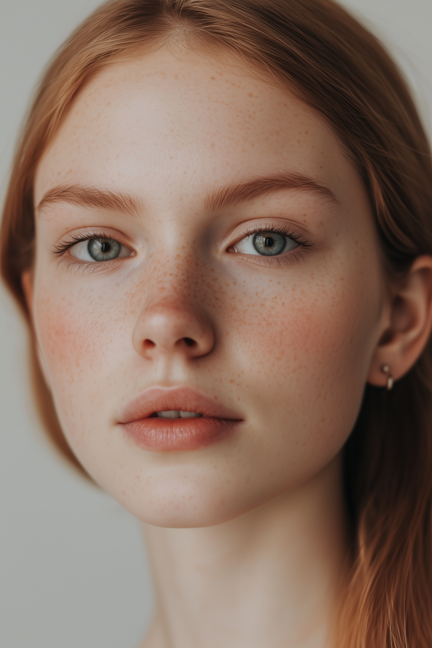 Close-up of a young woman with freckles, light green eyes, and auburn hair, wearing a small hoop earring against a soft blurred background.