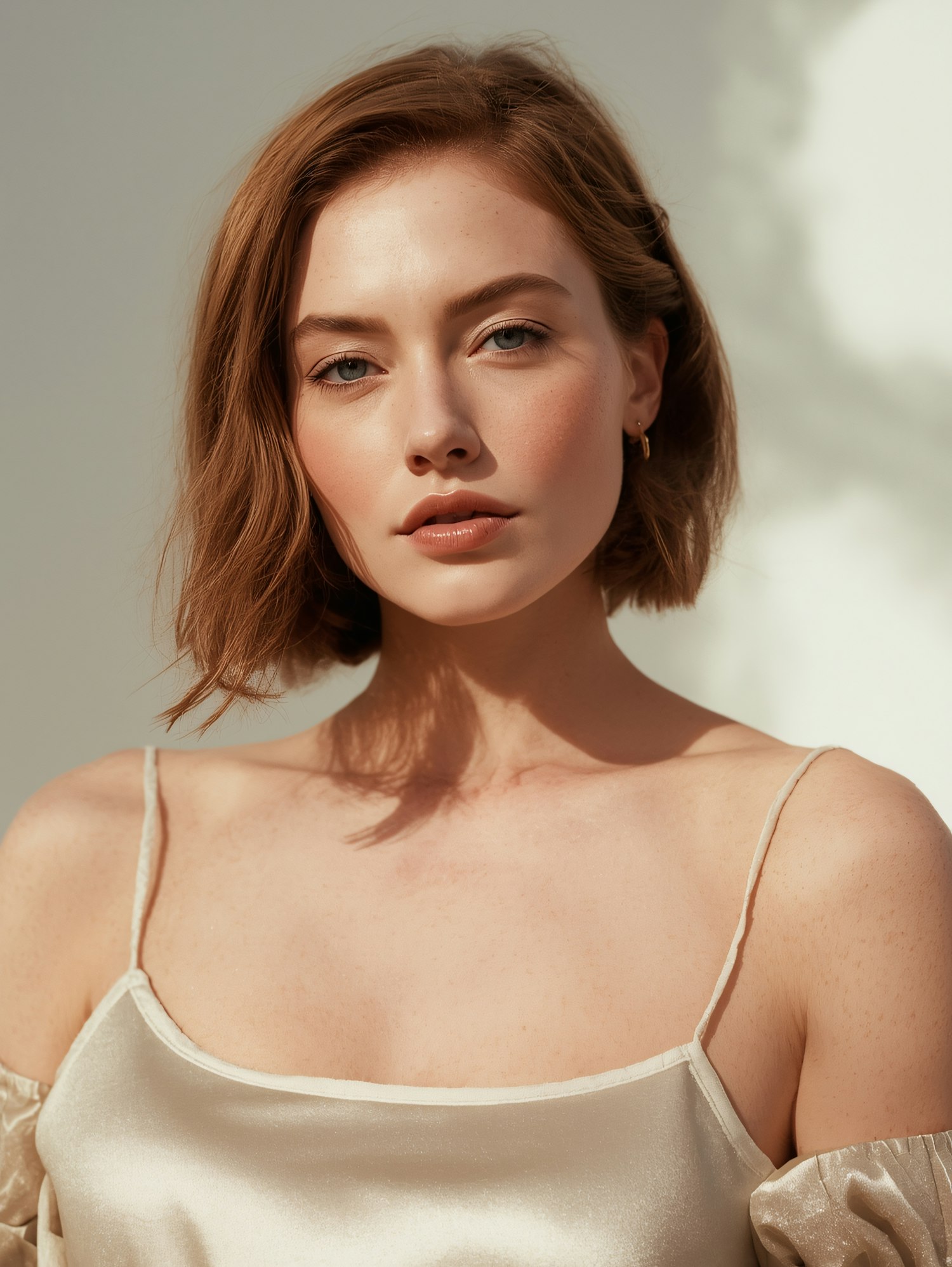 A young woman with short light brown hair and a silky top, captured in soft natural lighting against a neutral background.