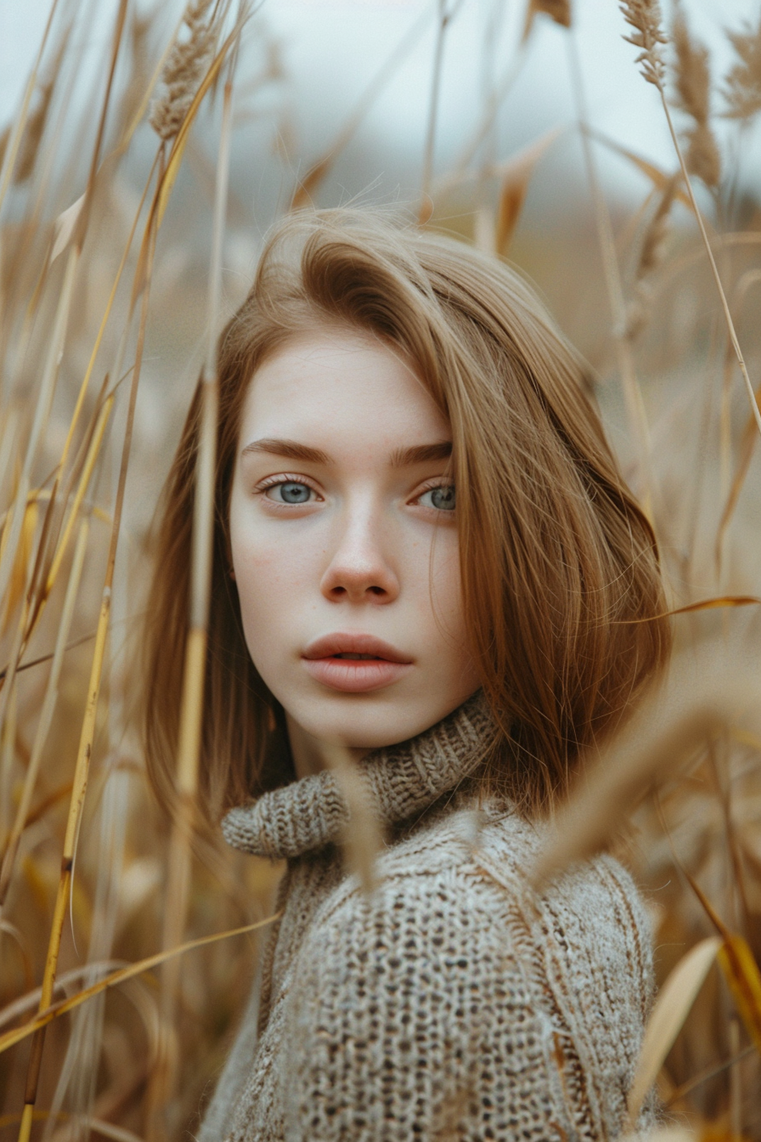 Young woman with light brown hair and blue eyes in a field of golden reeds, wearing a beige sweater. Calm and serene atmosphere.