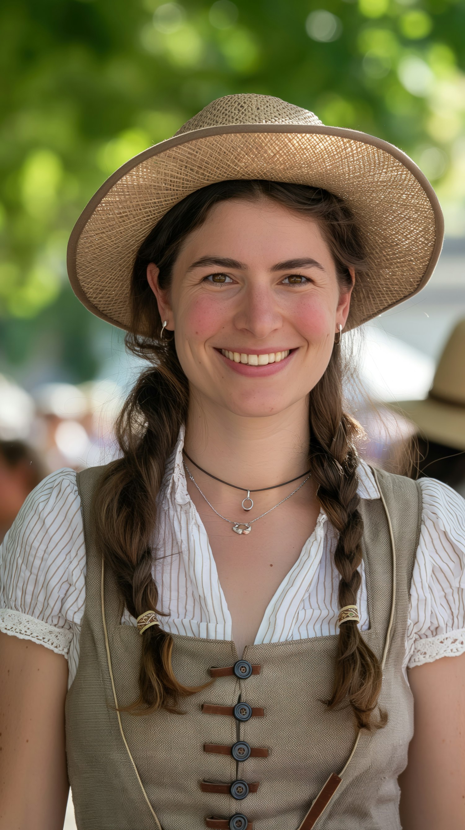 Smiling woman in traditional attire with a straw hat, outdoors. Bright, cheerful expression with braided hair and minimal makeup.