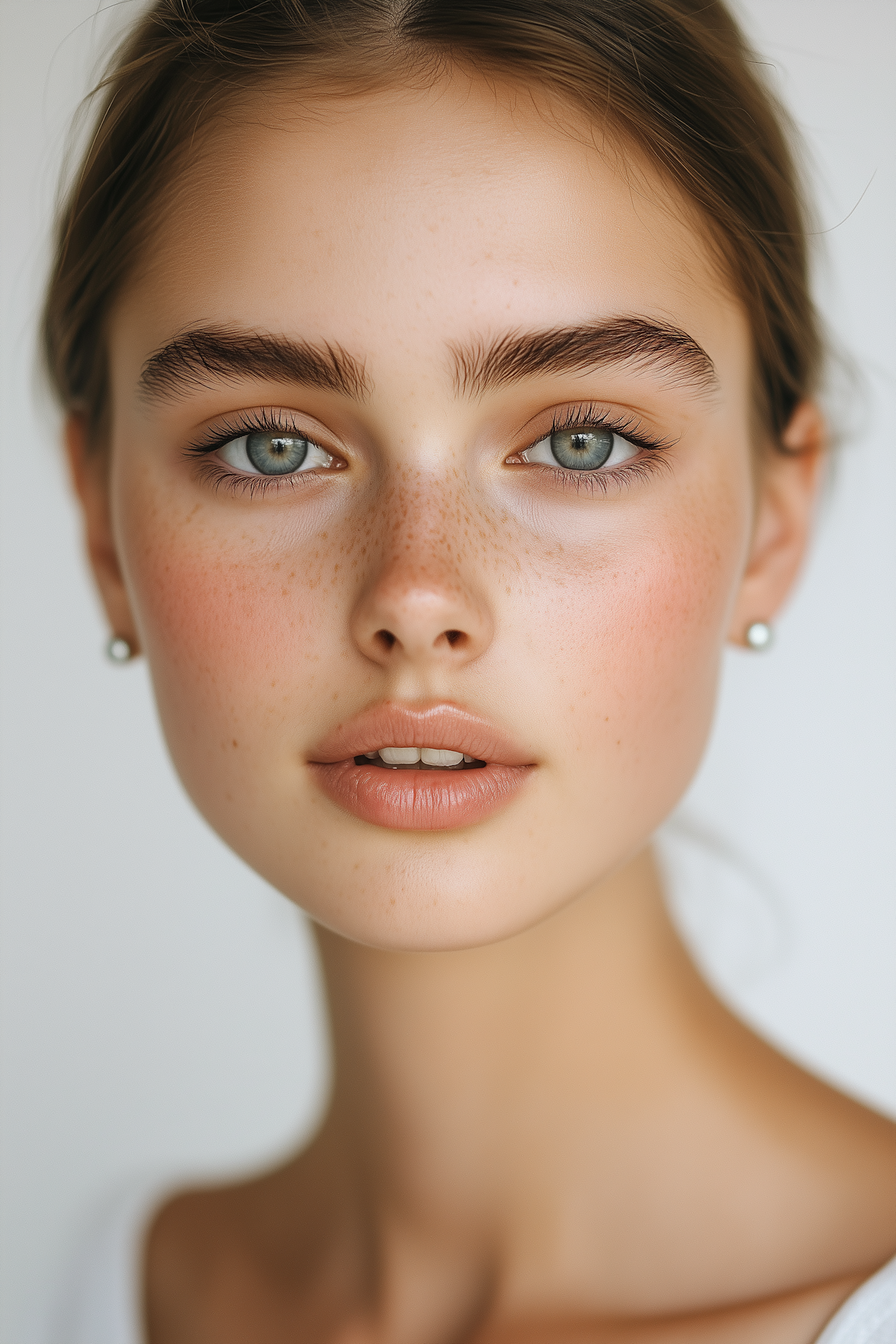 Close-up of a young woman with green eyes, freckles, and pearl earrings, set against a soft white background.