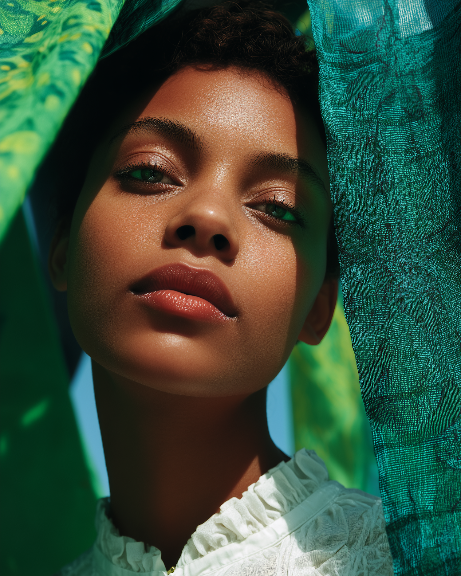 Close-up of a young woman with green eyes and a white blouse, framed by vibrant green and turquoise fabric in sunlight.
