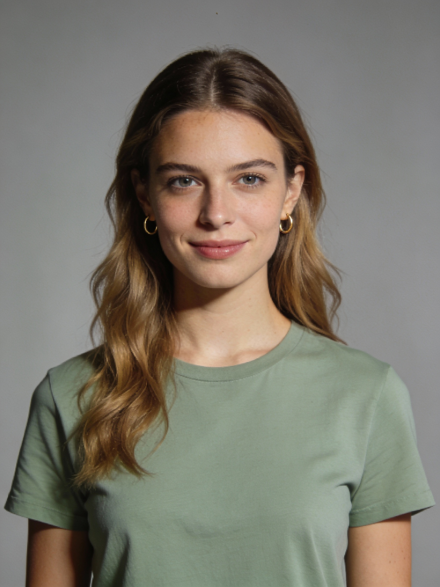 Studio portrait of a French female plant lover in her late 20s; fair skin, cool undertone; long wavy light brown hair, parted in the middle; soft sage-green t-shirt, no logos; small gold hoop earrings; neutral mid-gray seamless backdrop; Rembrandt lighting with soft fill; 105 mm macro-sharp. Expression: calm and earthy, gentle closed-mouth smile. Framing: portrait orientation, 3:4 ratio; mid-chest-up composition. Subject centered in frame, camera at eye level, facing directly toward the camera (front view). Full head and hair completely inside the frame with a little space above; both shoulders visible, no cropping at the top or sides. Neutral studio composition, no props.