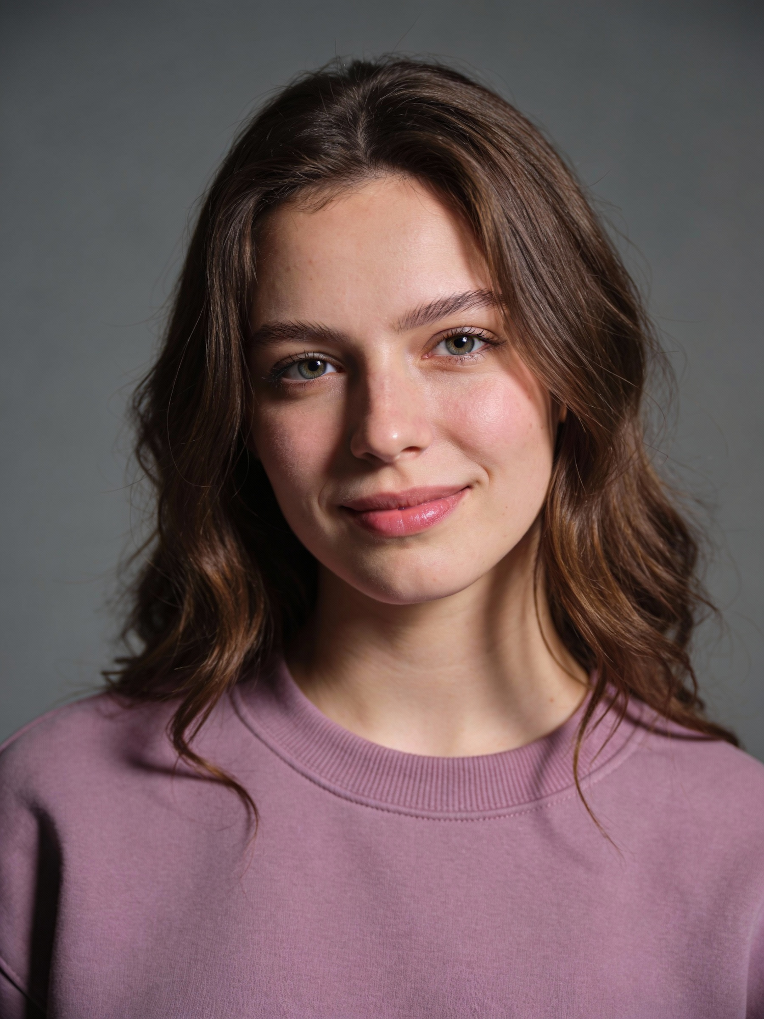 Studio portrait of an Eastern European female in her late 20s; fair skin, pink-neutral undertone; medium brown hair worn loose with natural waves; no visible jewelry; wearing a plain muted-lilac sweatshirt, no logos; neutral cool-gray seamless backdrop; Rembrandt lighting with soft fill; 105 mm macro-sharp, f/7.1, ISO 100, ultra-high detail, crisp micro-contrast, no smoothing or blur. Expression: gentle and relaxed, slightly introspective smile. Framing: portrait orientation, 3:4 ratio; mid-chest-up, centered at eye level; full head and hair visible.