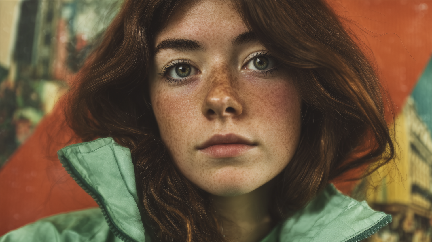 Close-up of a freckled young woman with green eyes and auburn hair, wearing a green jacket against a blurred urban background.