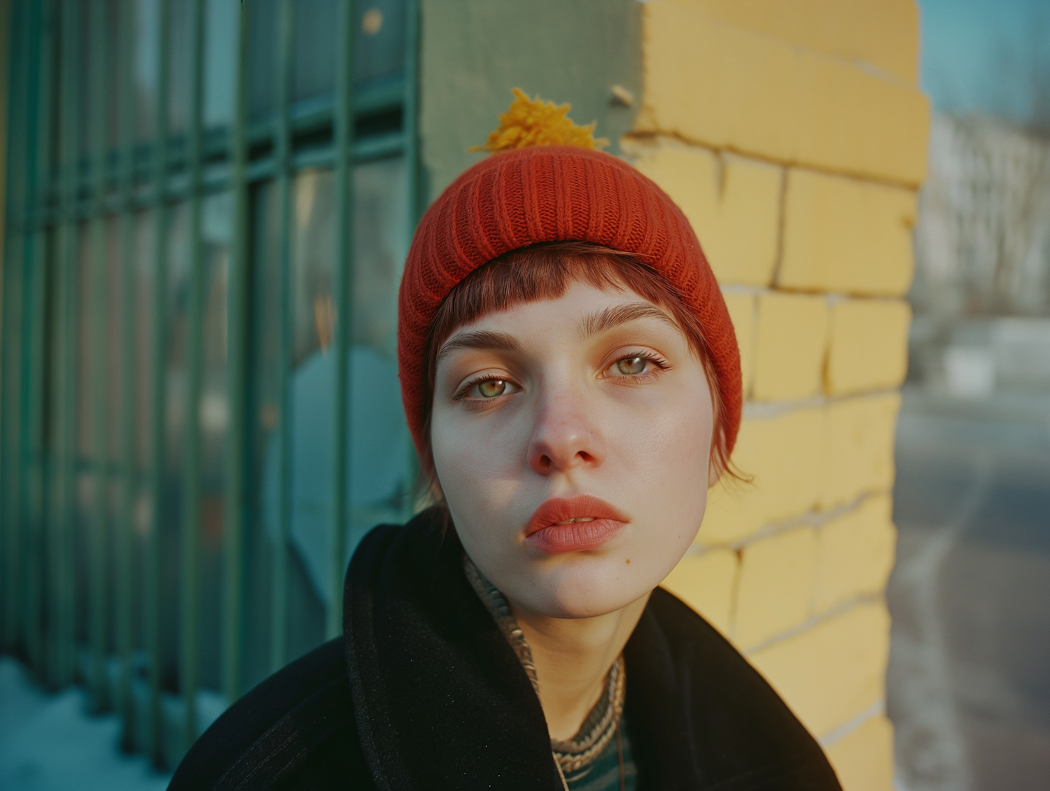 Young woman in red beanie against yellow brick wall, urban setting, soft lighting, calm expression.