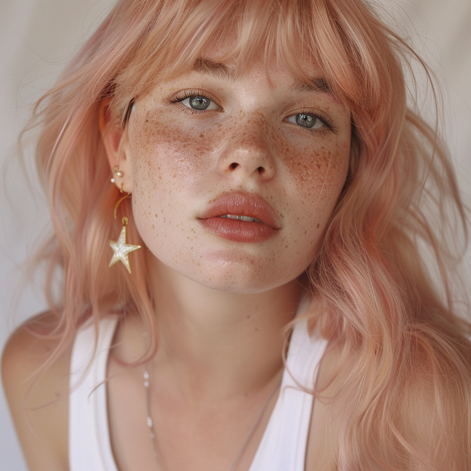 Young woman with pastel pink hair and freckles, wearing a star earring and white tank top, gazes with light blue eyes.