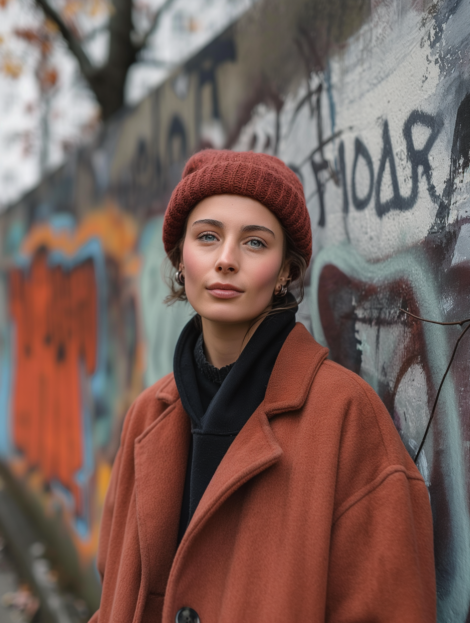 Young woman in rust coat and beanie stands against graffiti wall, exuding urban style and confidence.