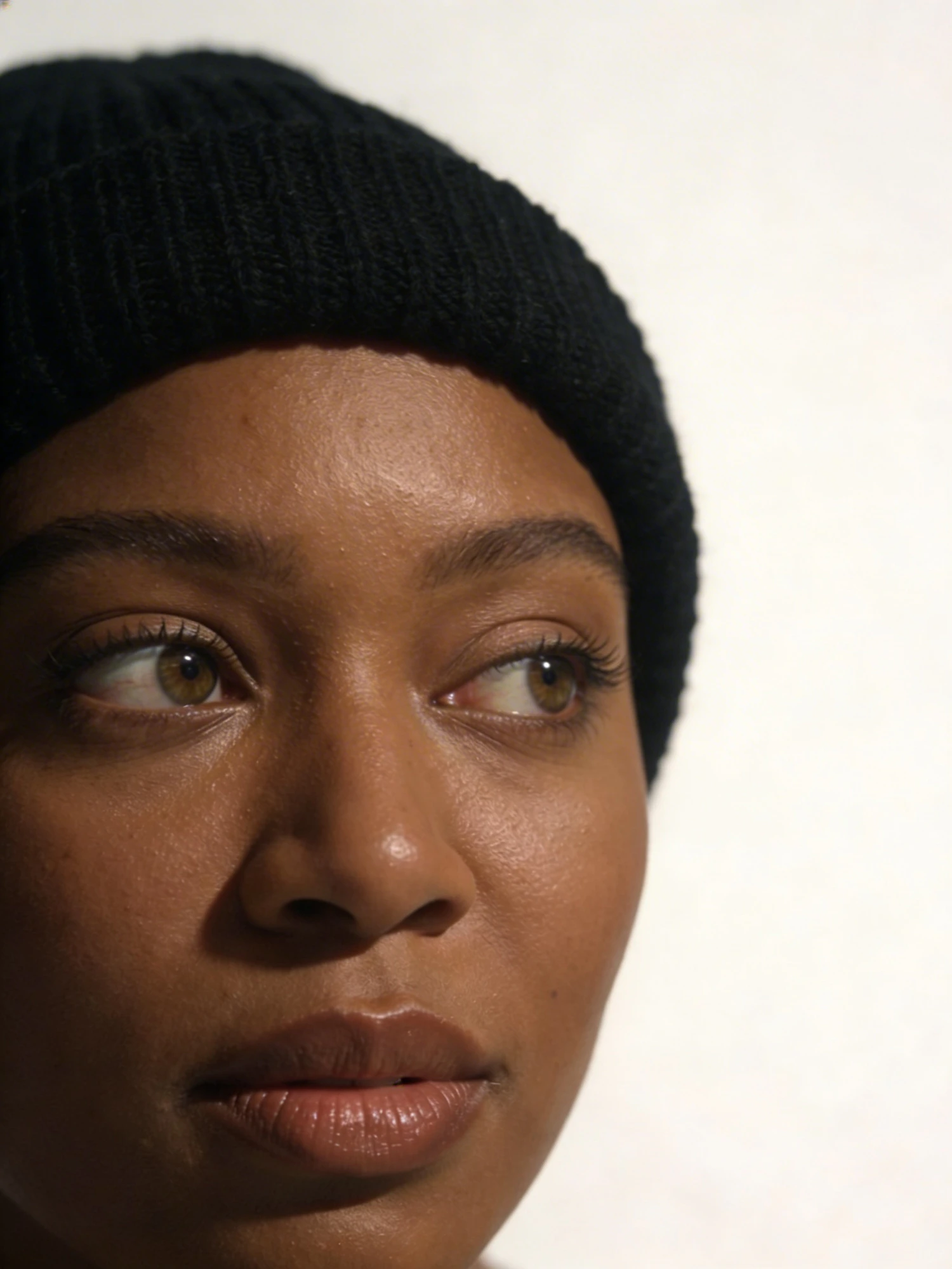 Close-up of a person with brown skin, light brown eyes, and a black beanie, captured in soft lighting against a plain background.