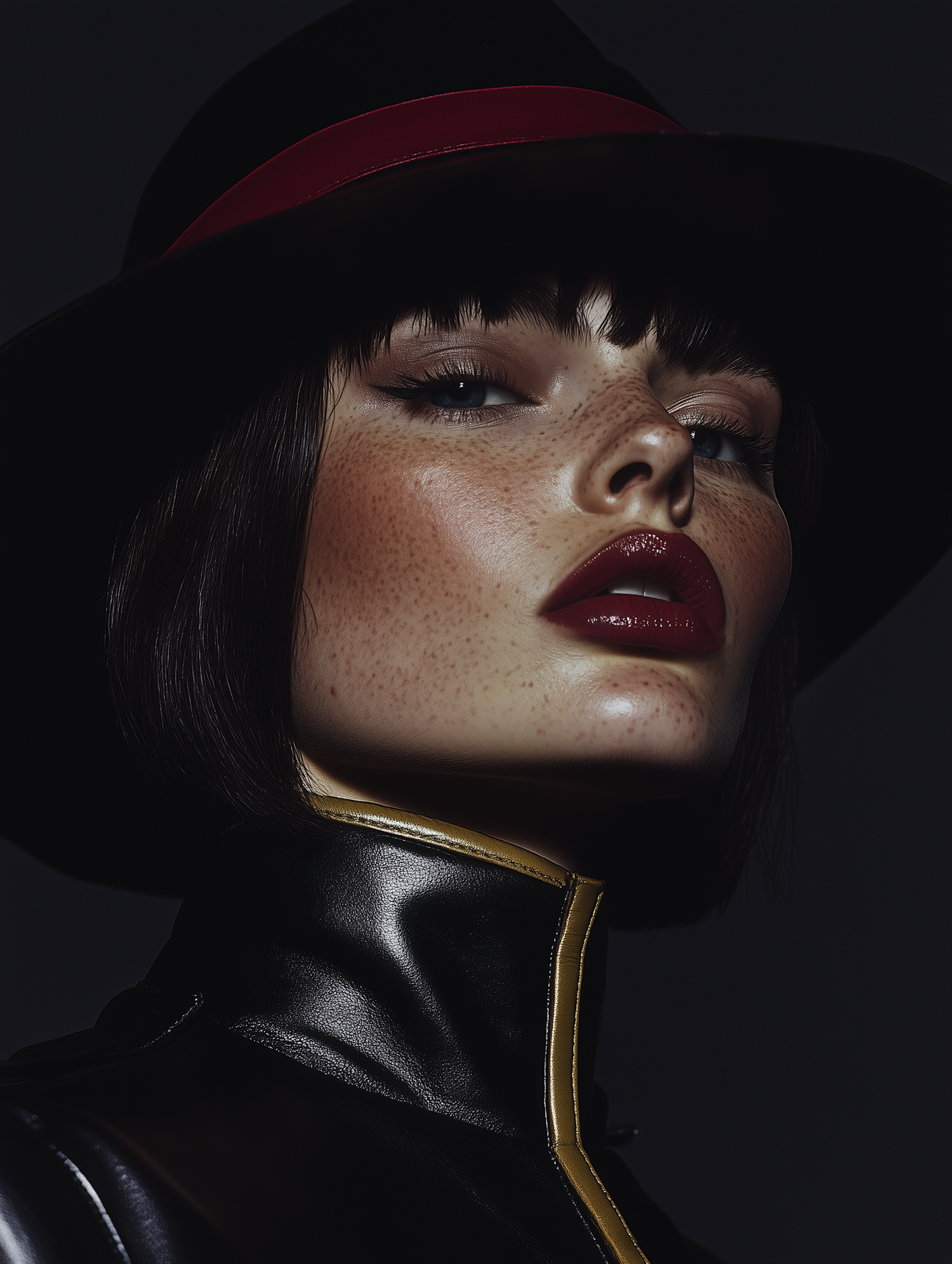 Close-up of a woman with freckles, red lipstick, and a black hat. Dramatic lighting highlights her confident expression.