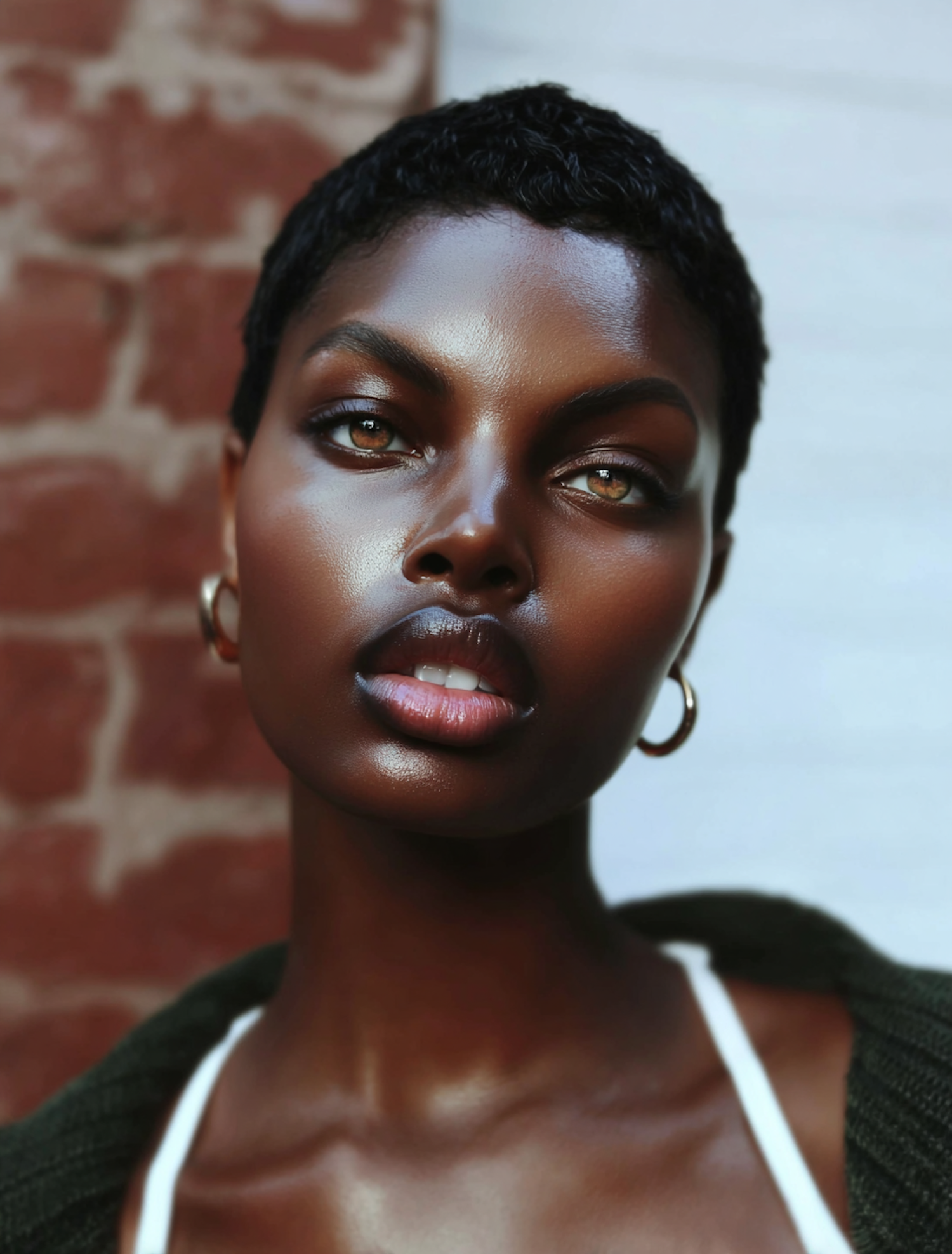 A portrait of a person with warm brown skin, hazel eyes, and short curly black hair wearing gold hoop earrings against a brick background.