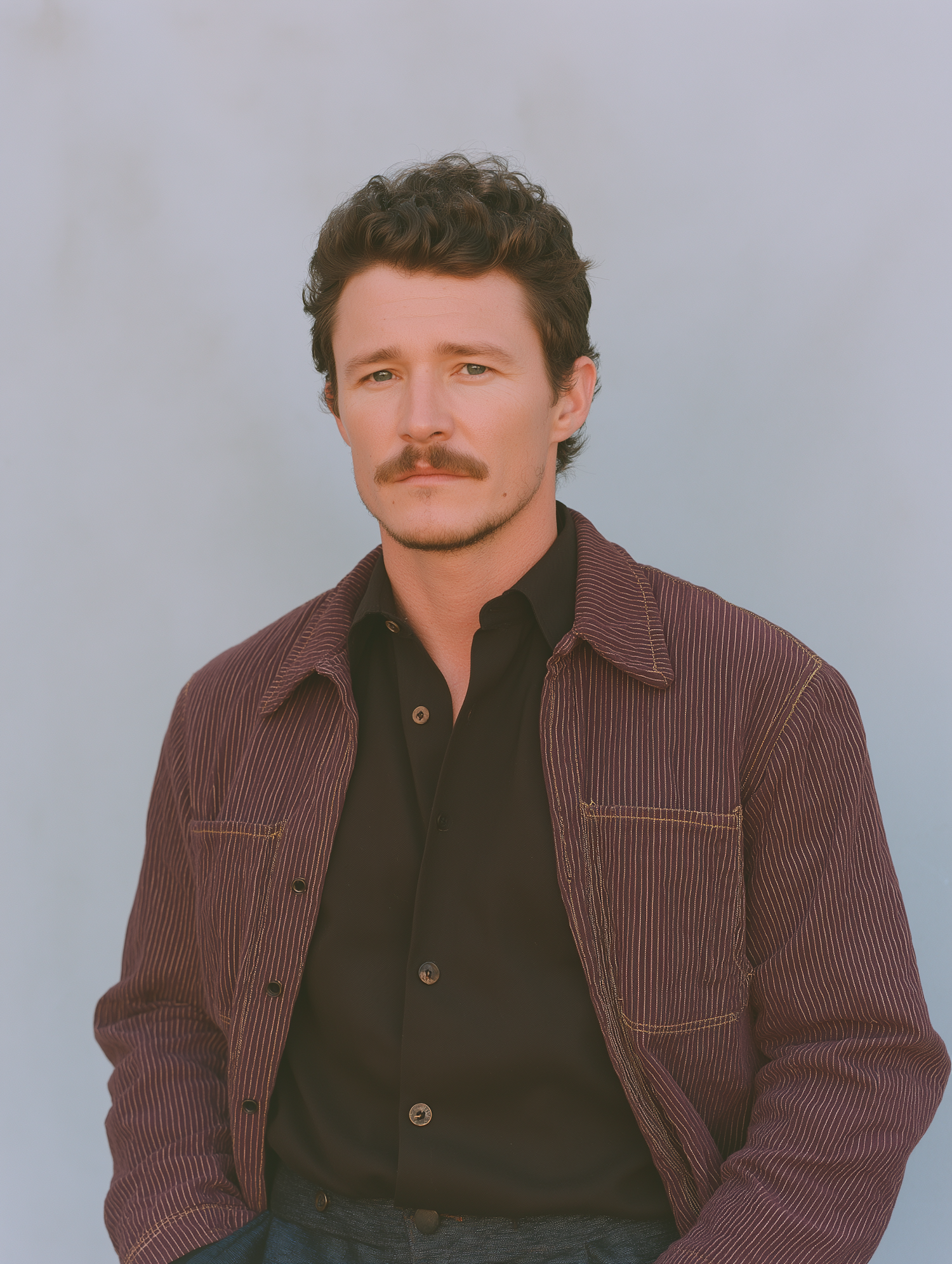 Portrait of a man in a striped burgundy jacket and black shirt against a neutral backdrop, featuring soft and even lighting.