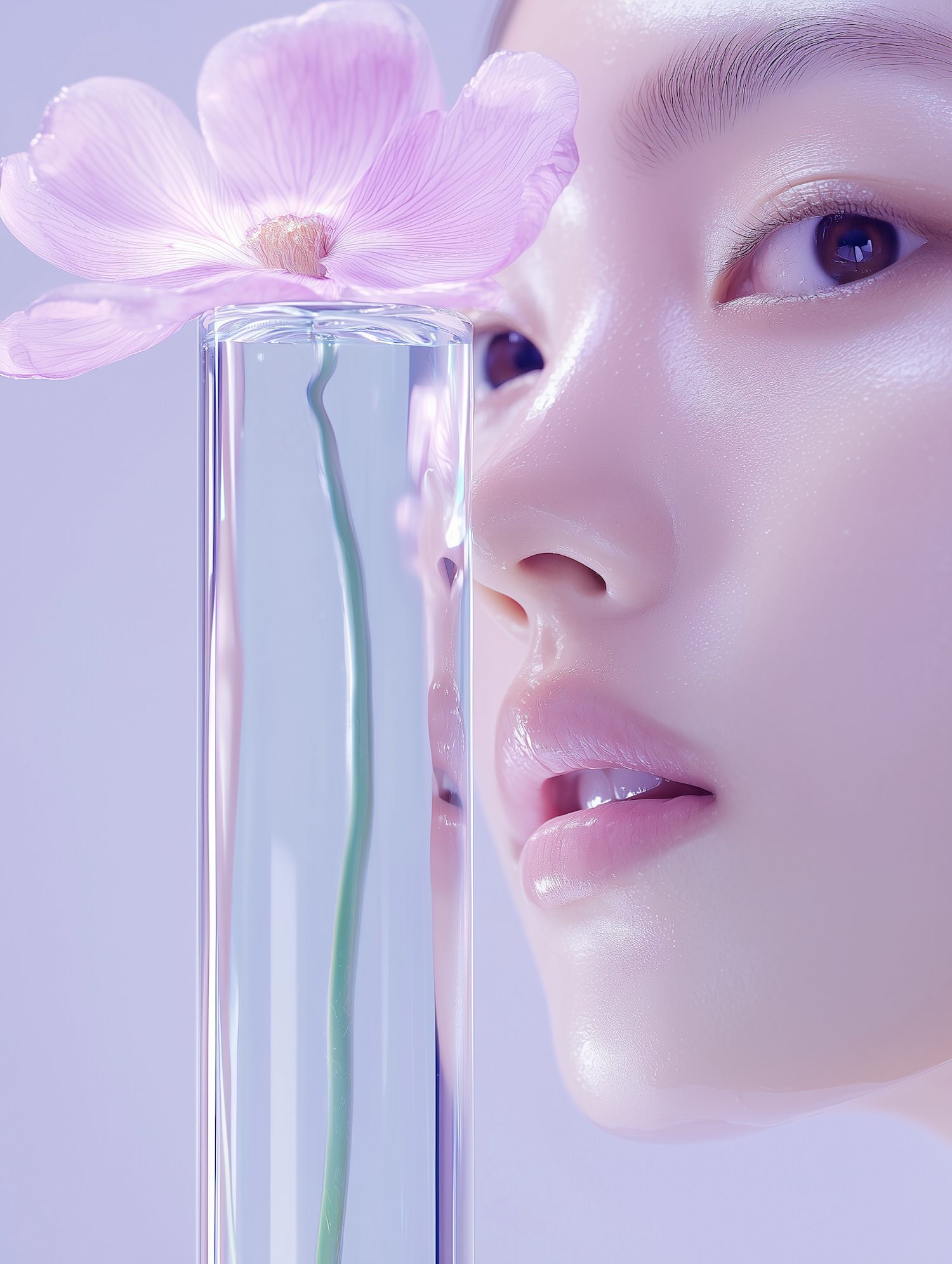 Close-up of a dewy-skinned woman with a pink flower in a glass tube, set against a soft lavender background. Ethereal and serene vibe.