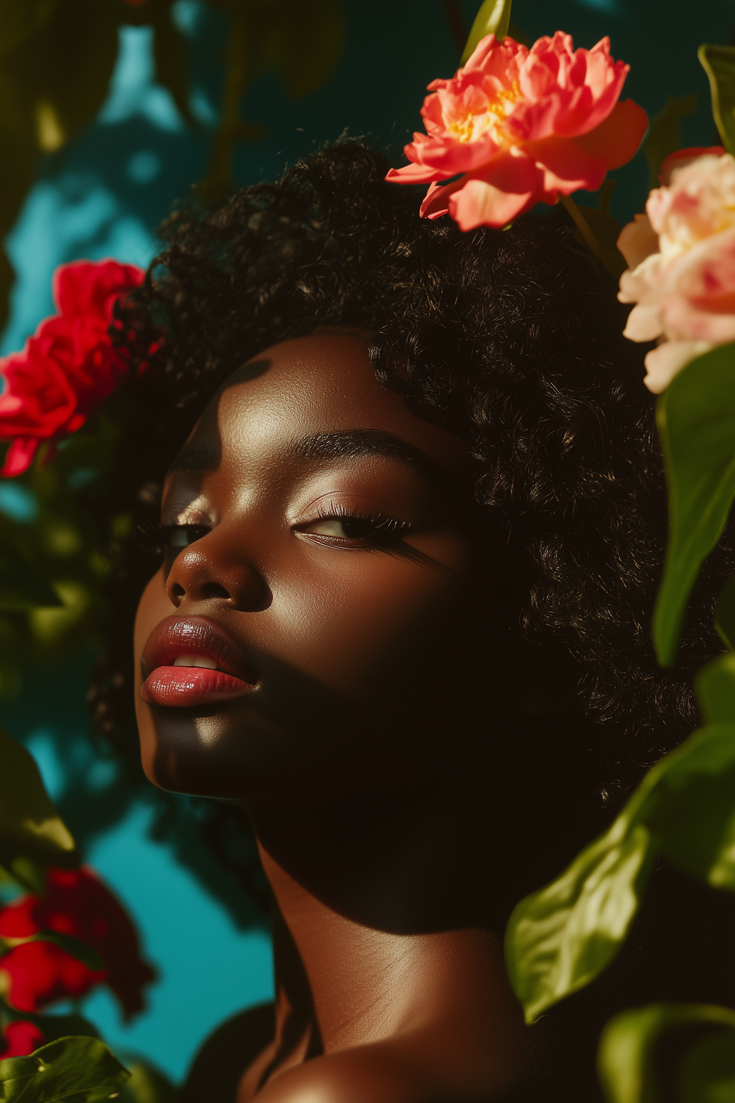 A stunning portrait of a Black woman with glowing skin, surrounded by vibrant flowers and dramatic sunlight, set against a vivid blue background.