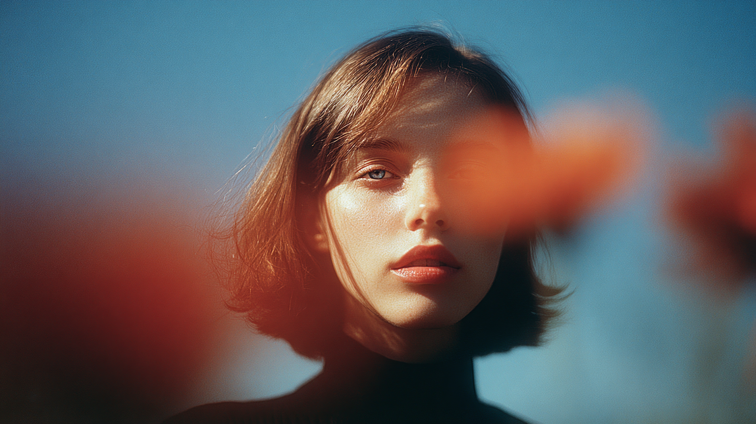 Portrait of a young woman with short brown hair, wearing a black turtleneck, against a blue sky with blurred red flowers in the foreground.