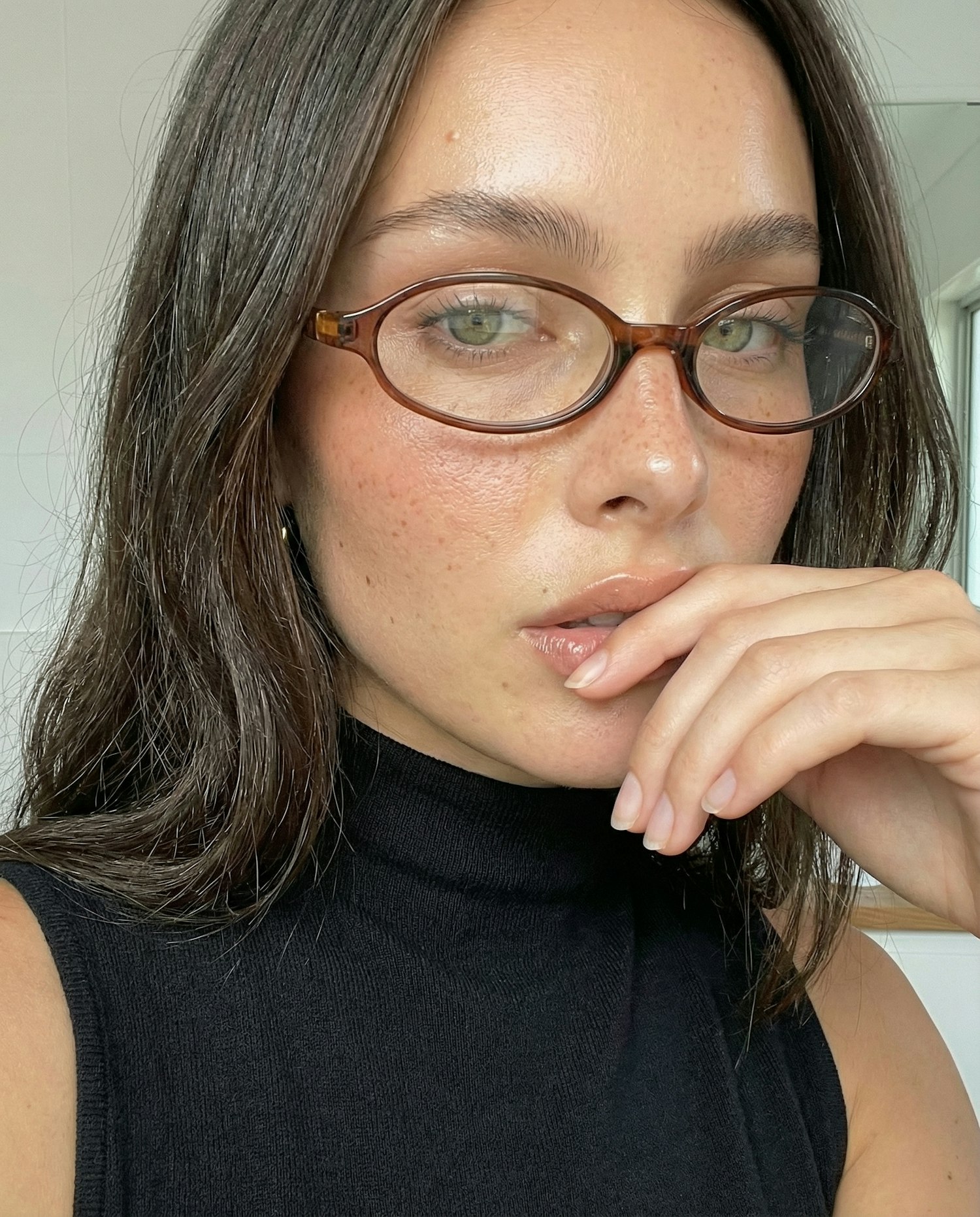Close-up of a person with green eyes, tortoiseshell glasses, and dark brown hair, wearing a black turtleneck. Minimalist and elegant.