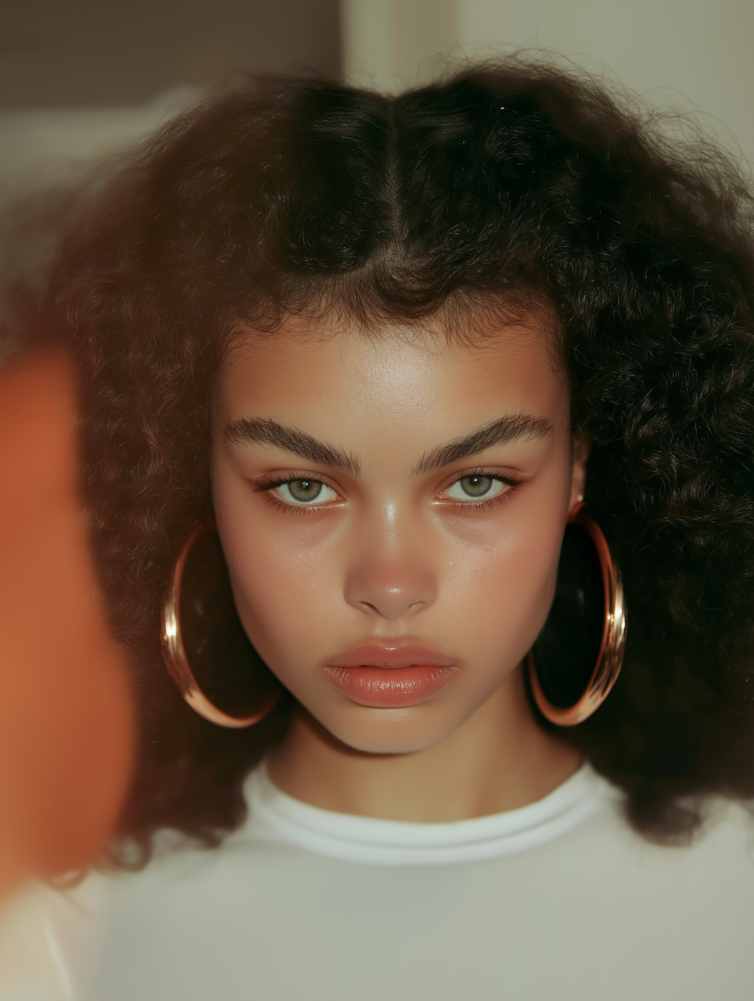 A portrait of a focused individual showcasing their bold fashion choice with golden hoop earrings and a natural beauty aesthetic.