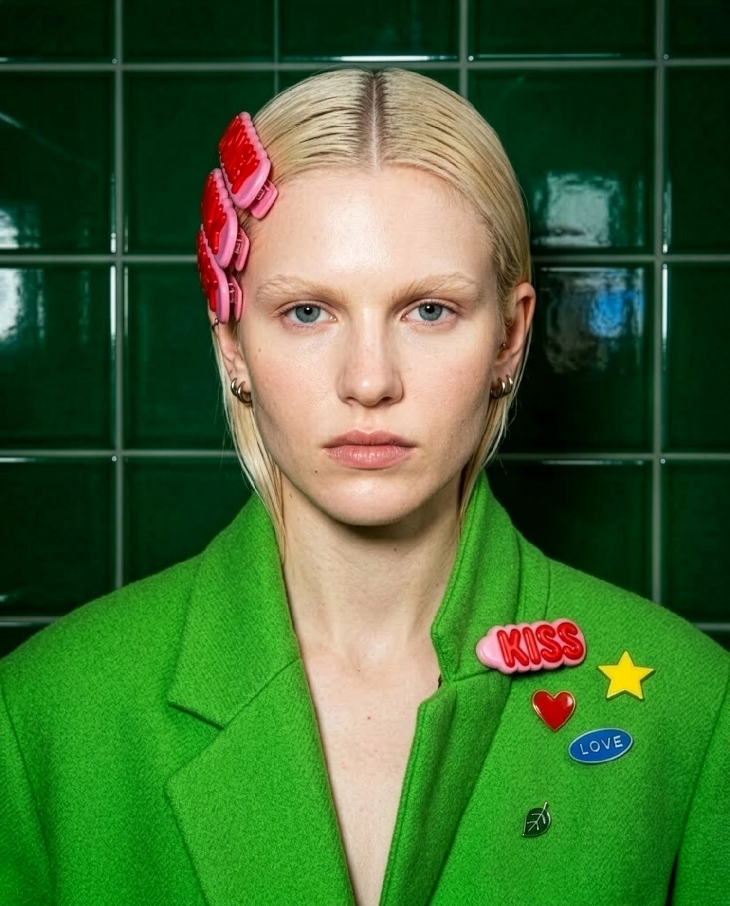 A person with blonde hair and a green coat adorned with colorful pins stands against a green tiled background.
