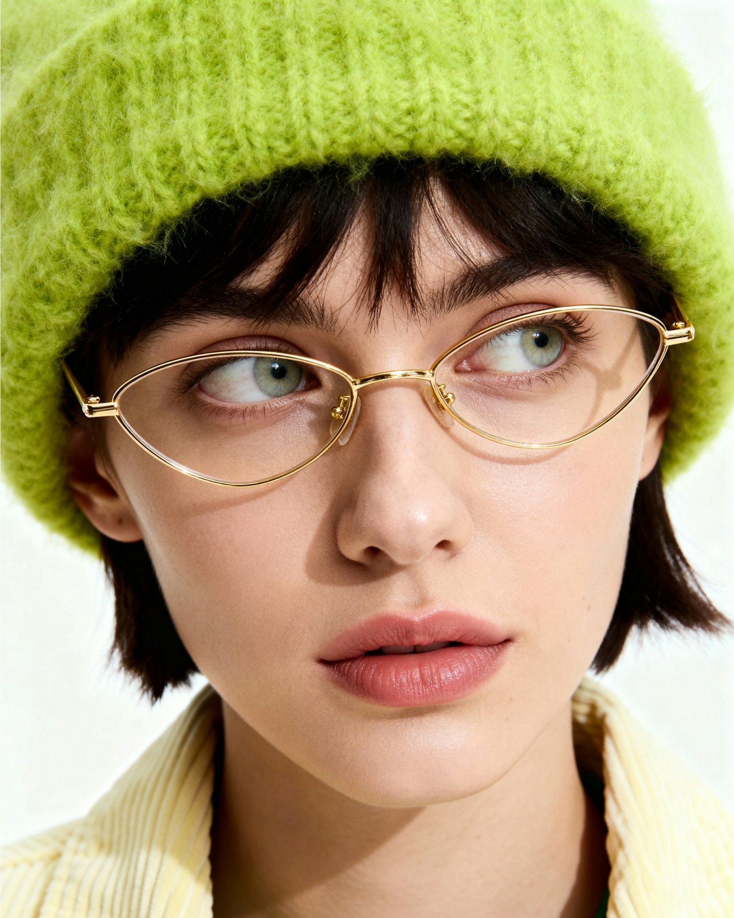Close-up of a person with a green knit hat, gold glasses, and a neutral expression, showcasing a stylish and modern look.