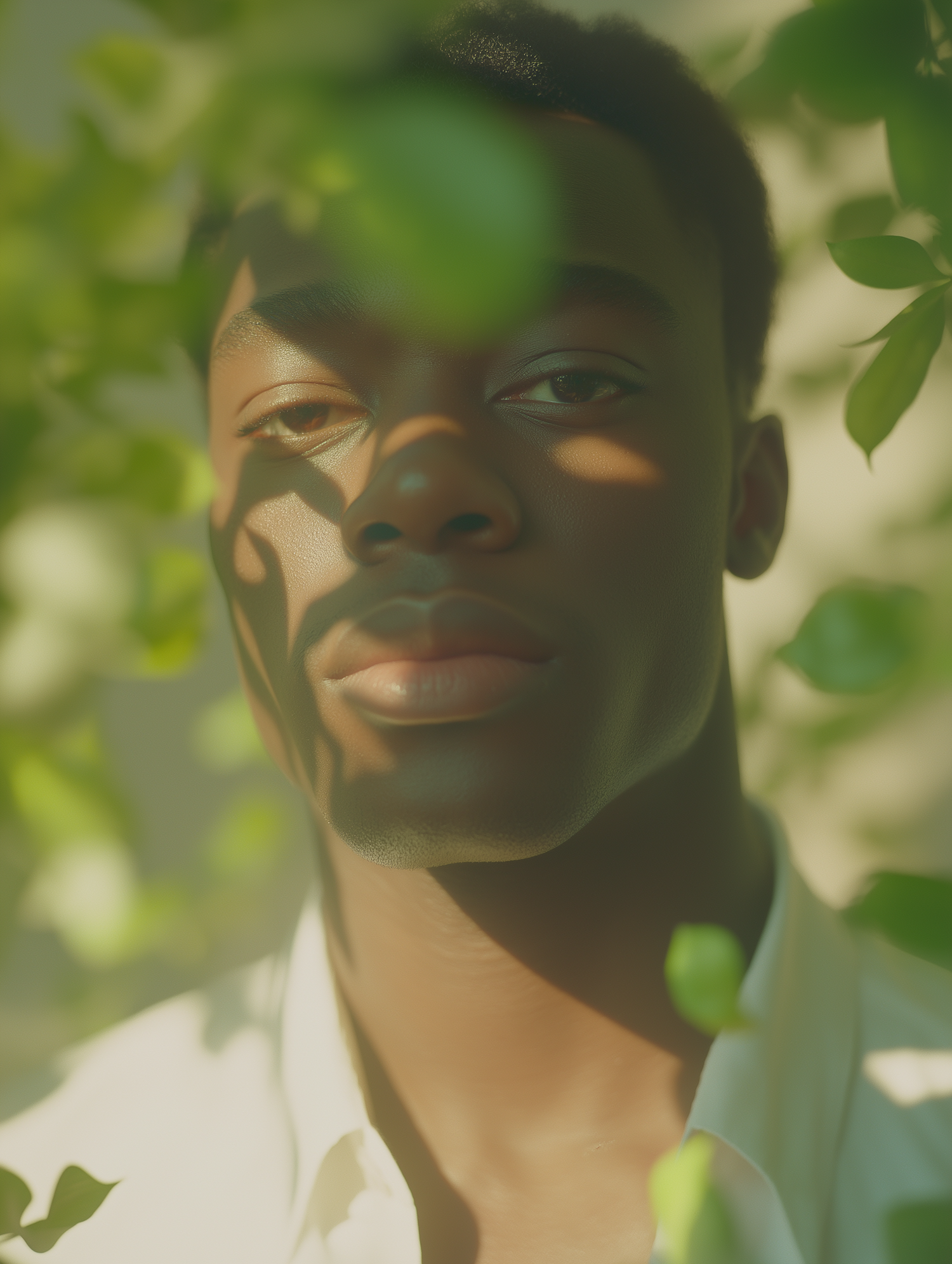 Close-up of a young man with natural lighting and green leaves casting shadows on his face, creating a serene and introspective vibe.