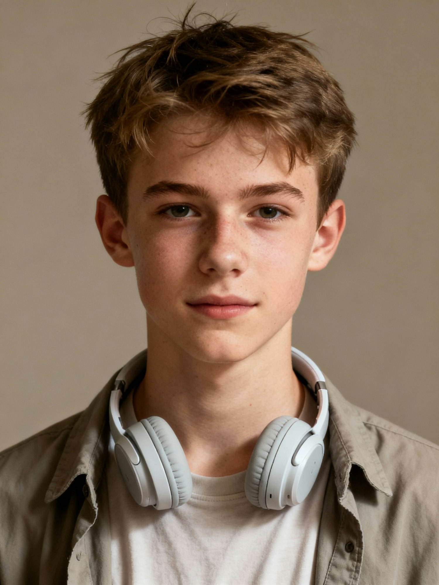 Studio portrait of a European male high-school student; fair skin; slightly messy short hair; casual t-shirt under open overshirt; neutral seamless backdrop; Rembrandt lighting; 105 mm macro-sharp; photorealistic. Light headphones rest around his neck. Expression: approachable, relaxed. Negative: brand logos, neon overlays.
