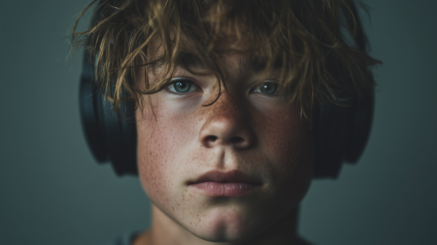 Close-up of a freckled young person with headphones, tousled hair, and a neutral expression, set against a muted background.