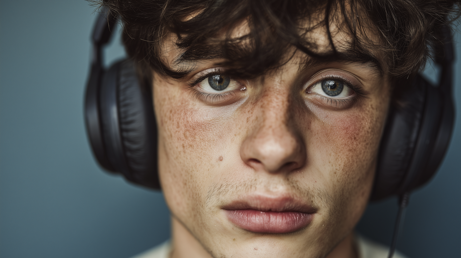 Close-up of a young person with freckles, blue eyes, and headphones, set against a muted blue background. Natural and detailed portrait.