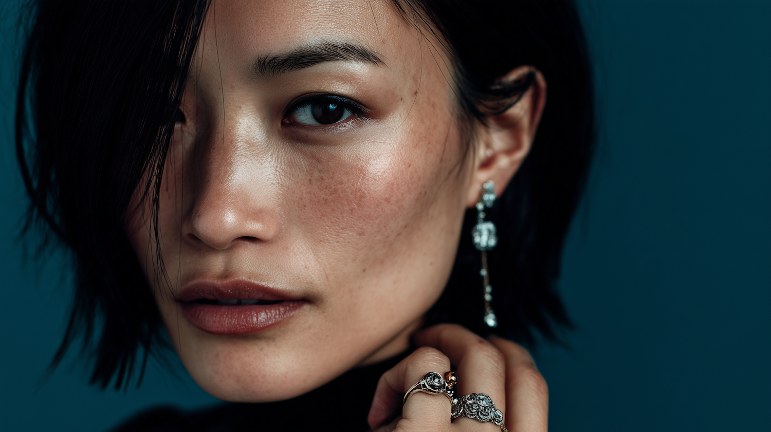 Close-up of a person with short black hair, wearing silver jewelry against a teal background, showcasing natural beauty and elegance.