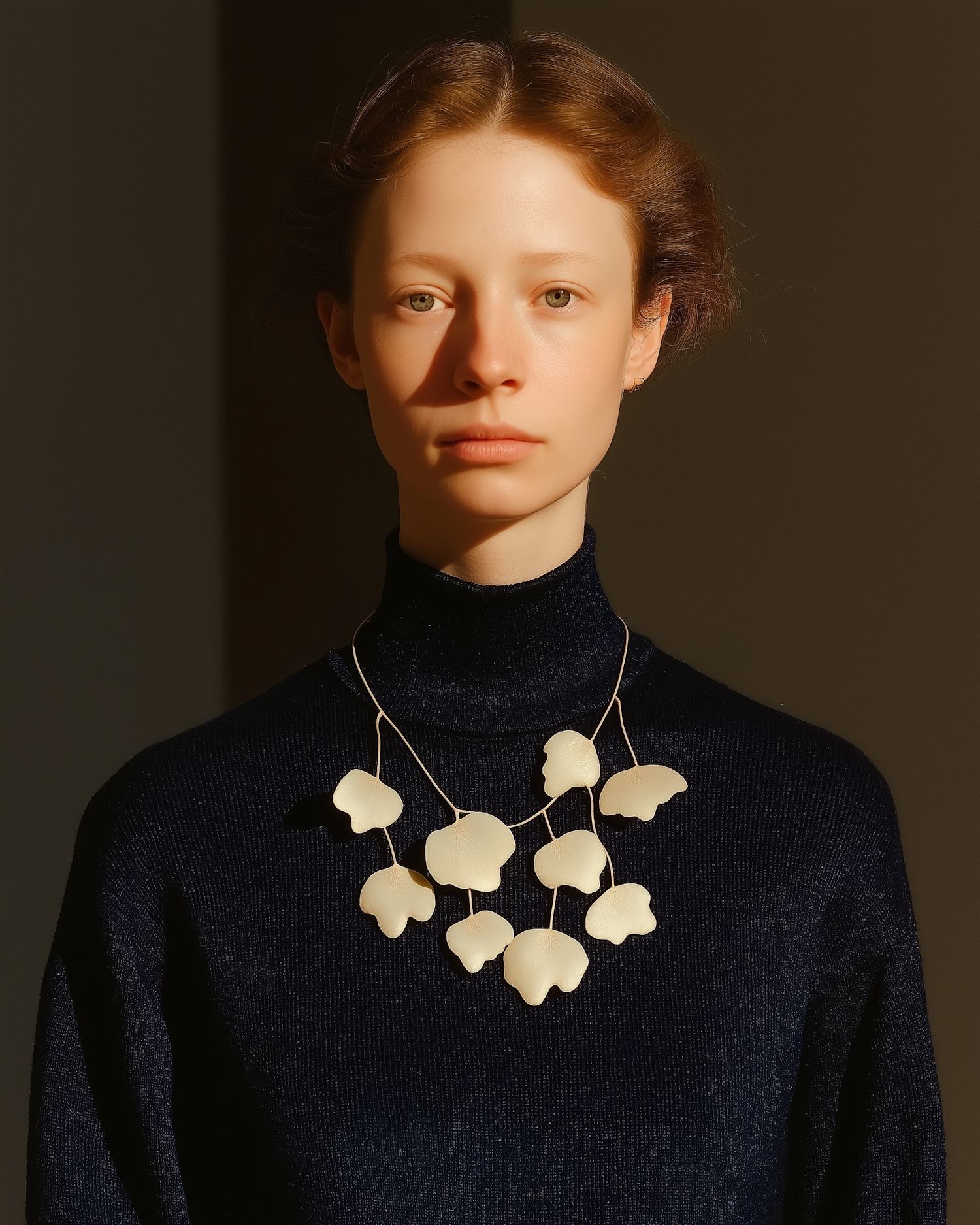 Young woman with light brown hair and unique necklace against a dark background, wearing a dark sweater.