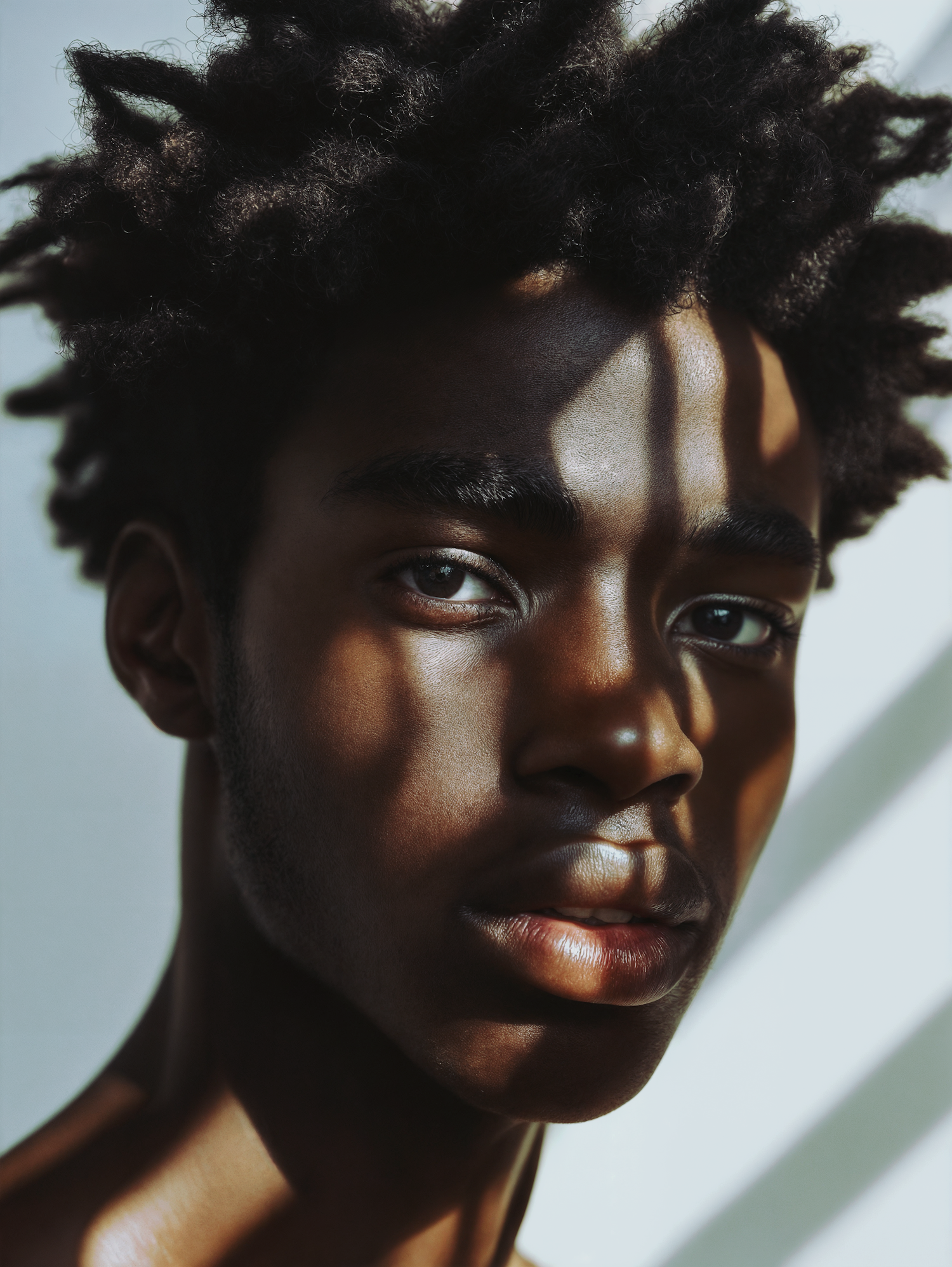 Portrait of a young Black man with textured hair, highlighted by dramatic lighting and shadows, creating a striking visual effect.