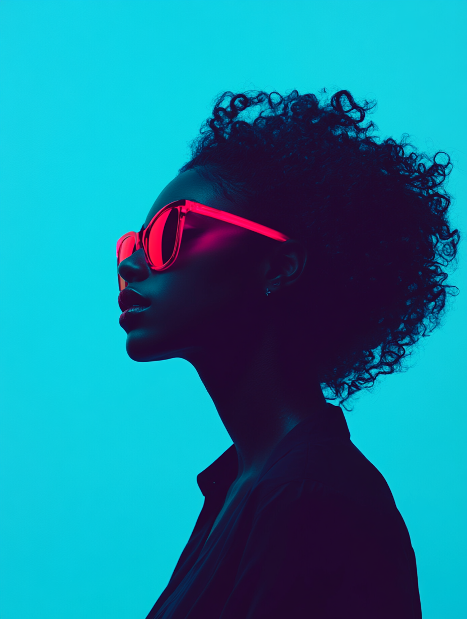 A bold profile shot of a woman in neon pink sunglasses against a vibrant blue background, showcasing a modern and artistic vibe.