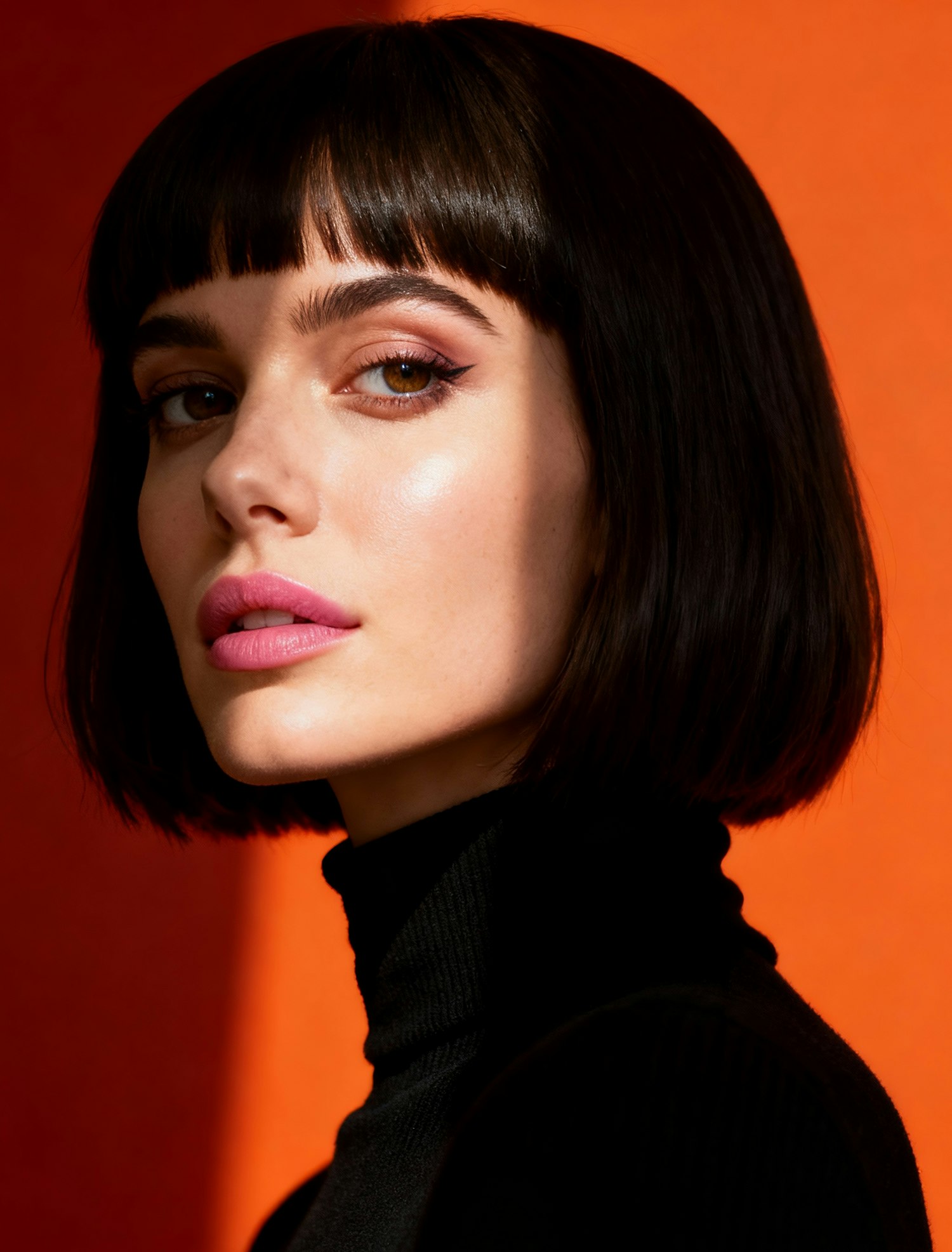 A striking portrait of a person with a black bob haircut, pink lipstick, and a black turtleneck against a vibrant orange background.