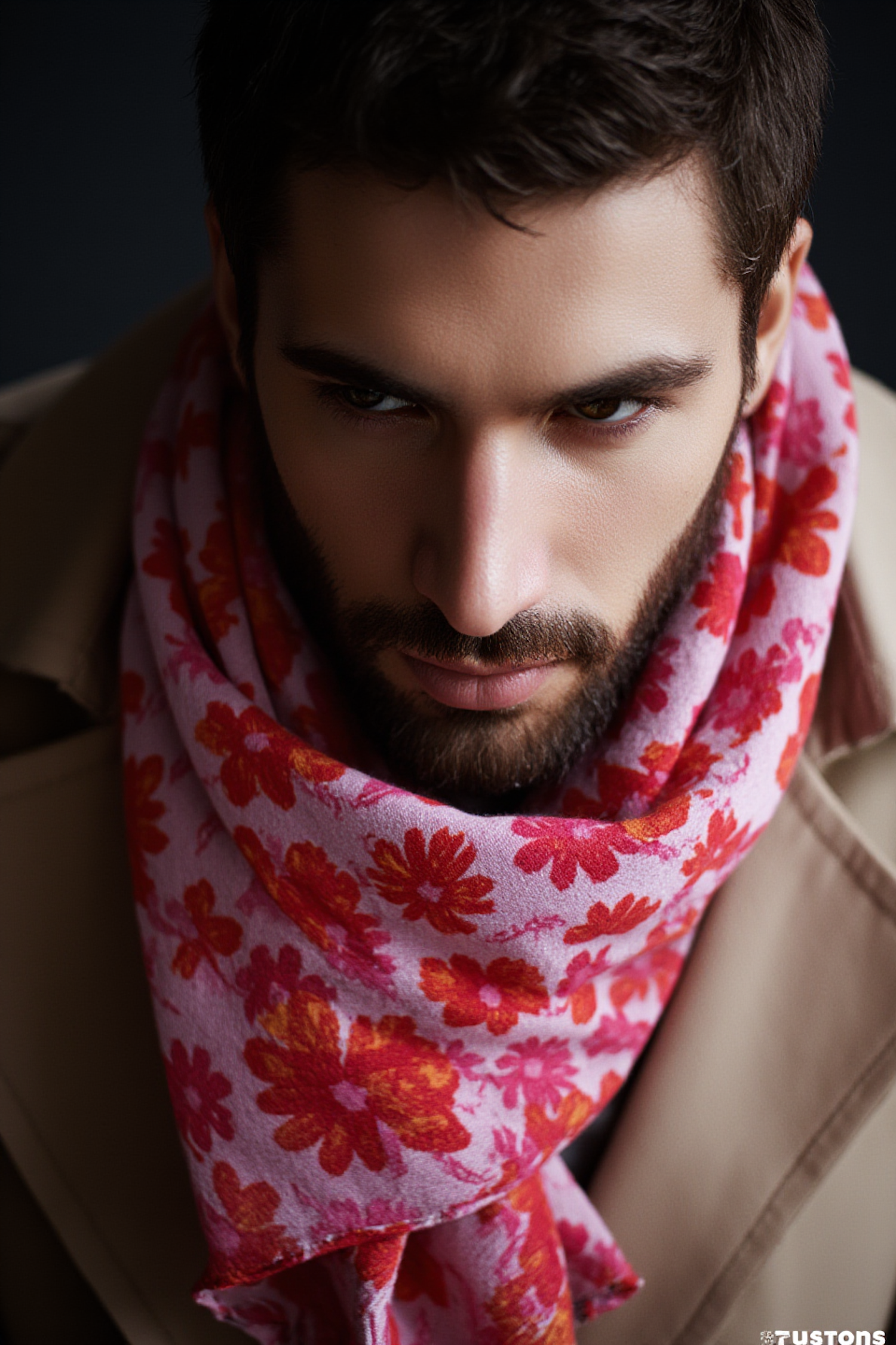 Stylish man in a beige coat and pink floral scarf, with a full beard and intense gaze, set against a dark background.