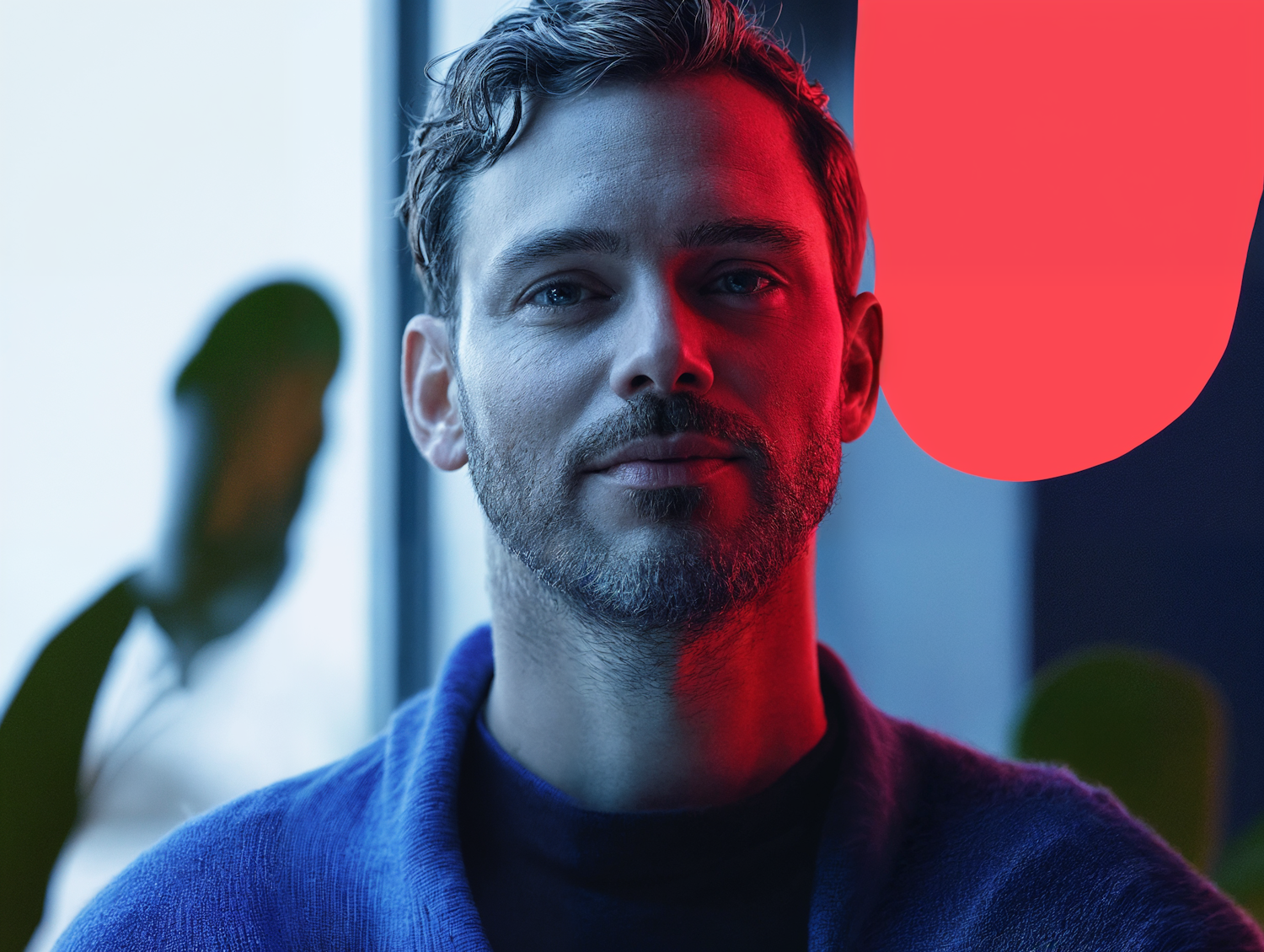 Artistic portrait of a man with blue and red lighting, wearing a dark blue sweater, with blurred plants and a window in the background.
