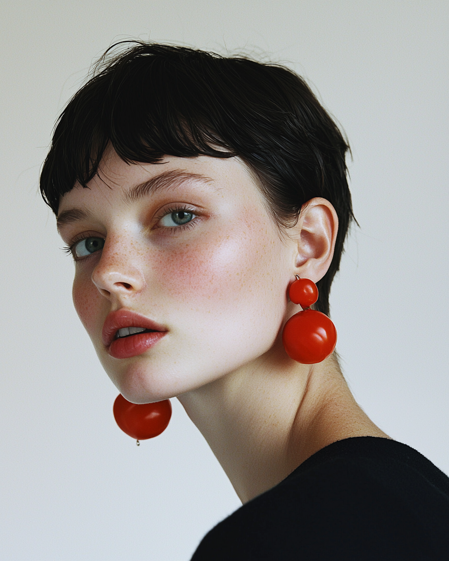 Close-up of a woman with short dark hair, bold red earrings, and natural freckles, set against a minimalist beige background.