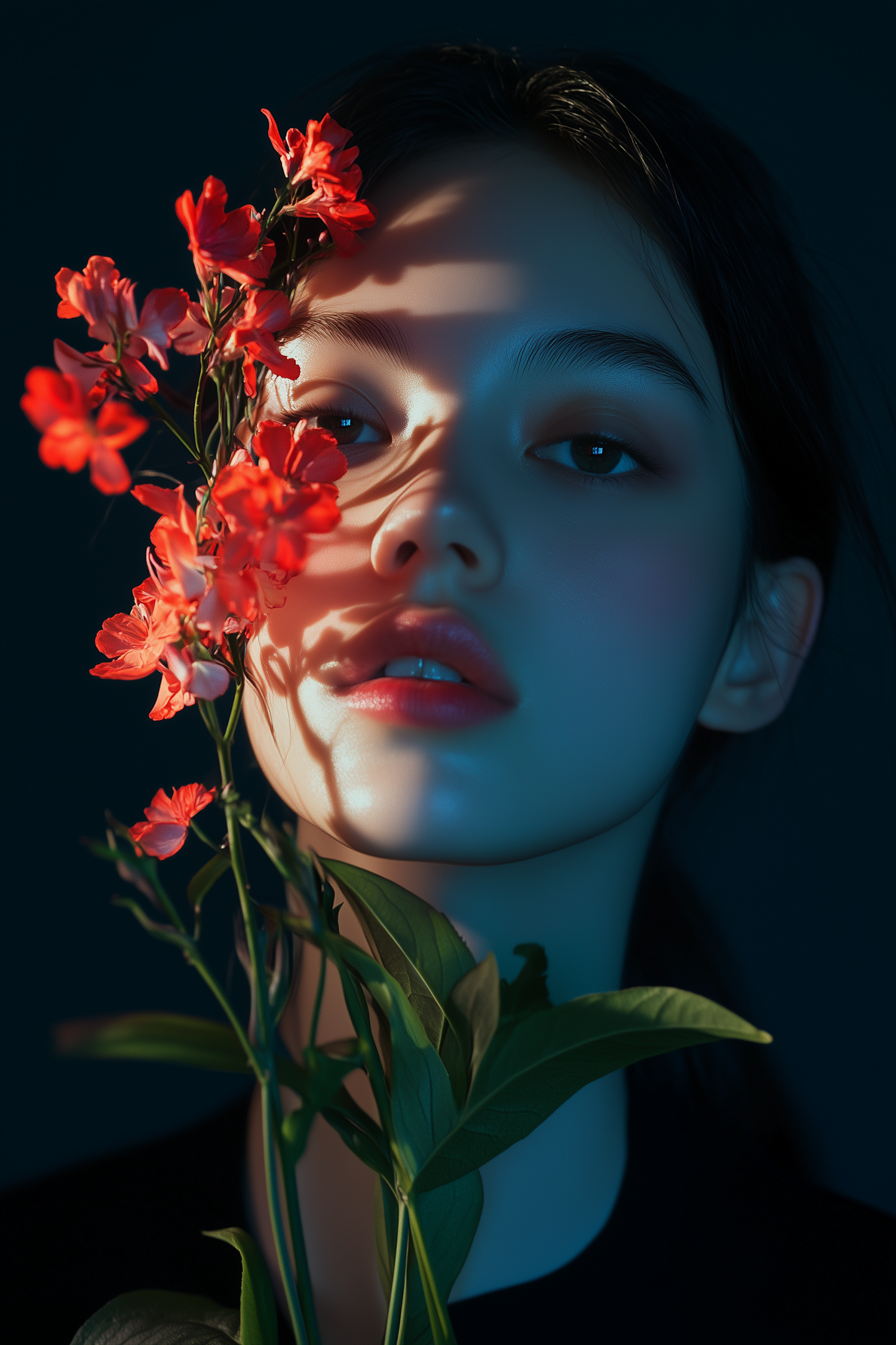 Close-up of a serene woman with red flowers casting shadows on her face, set against a dark background for a dramatic effect.