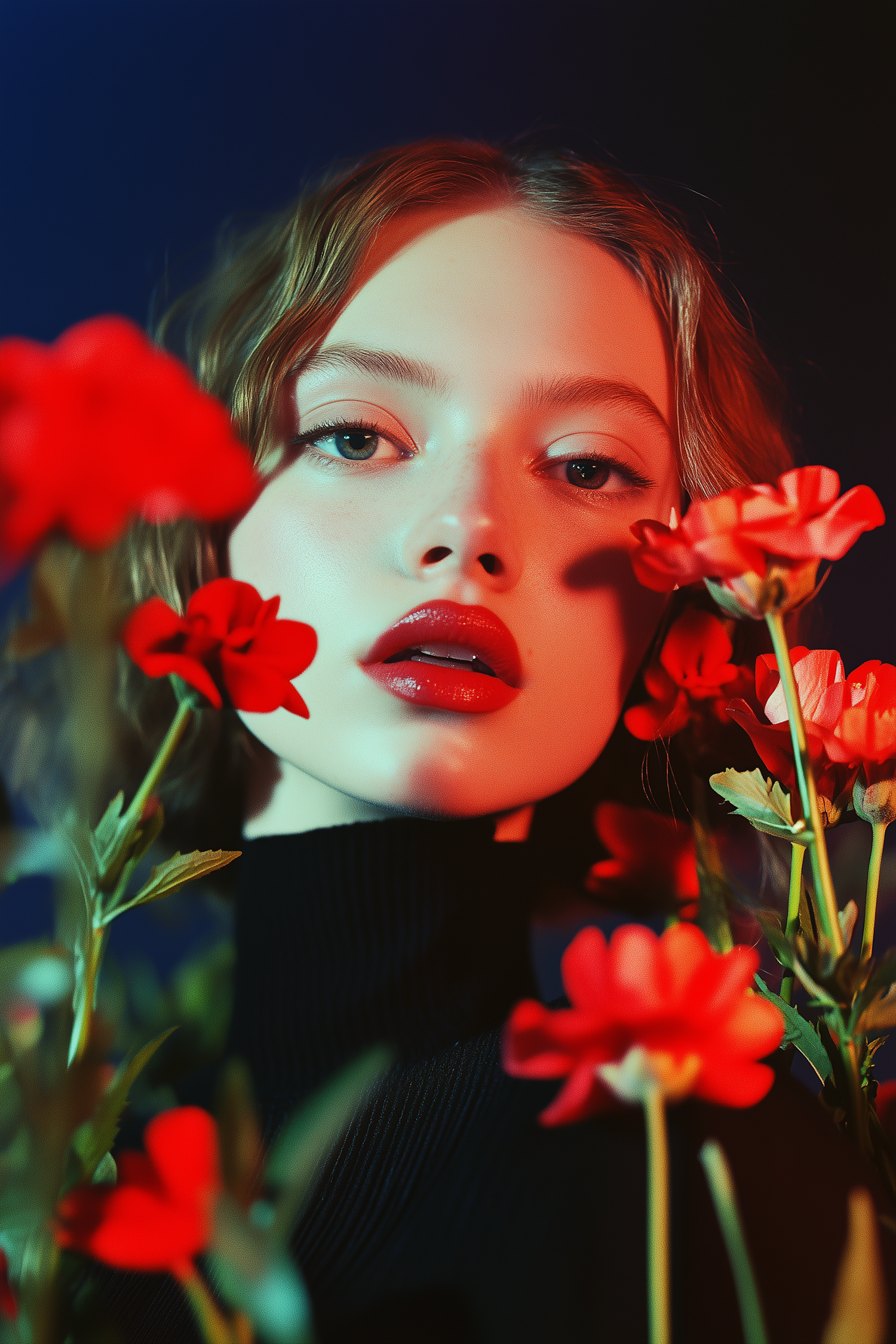 Close-up of a woman with red lips and vibrant flowers, dramatic lighting highlights her features against a dark background.